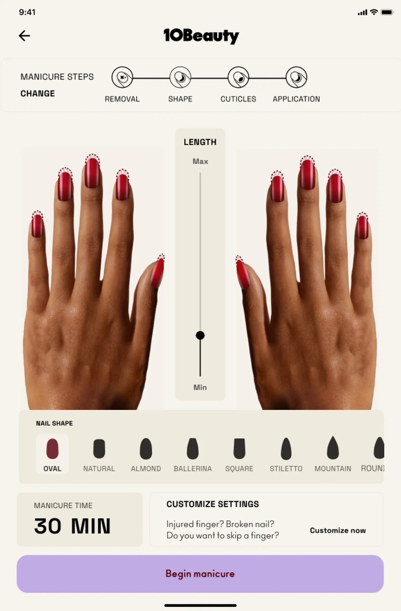 10Beauty jest jedyną firmą na świecie produkującą technologię zdolną do wykonania pełnego manicure bez interwencji człowieka. Wystarczy włożyć urządzenie do kapsuły, dostosować manicure w aplikacji mobilnej, wsunąć dłoń i pozwolić maszynie usunąć lakier, opiłować i nadać kształt paznokciom, usunąć skórki, nałożyć nowy lakier i wysuszyć produkt końcowy. Pełny proces manicure trwa mniej więcej tak długo, jak tradycyjny manicure, ale zgodnie z harmonogramem klienta.
