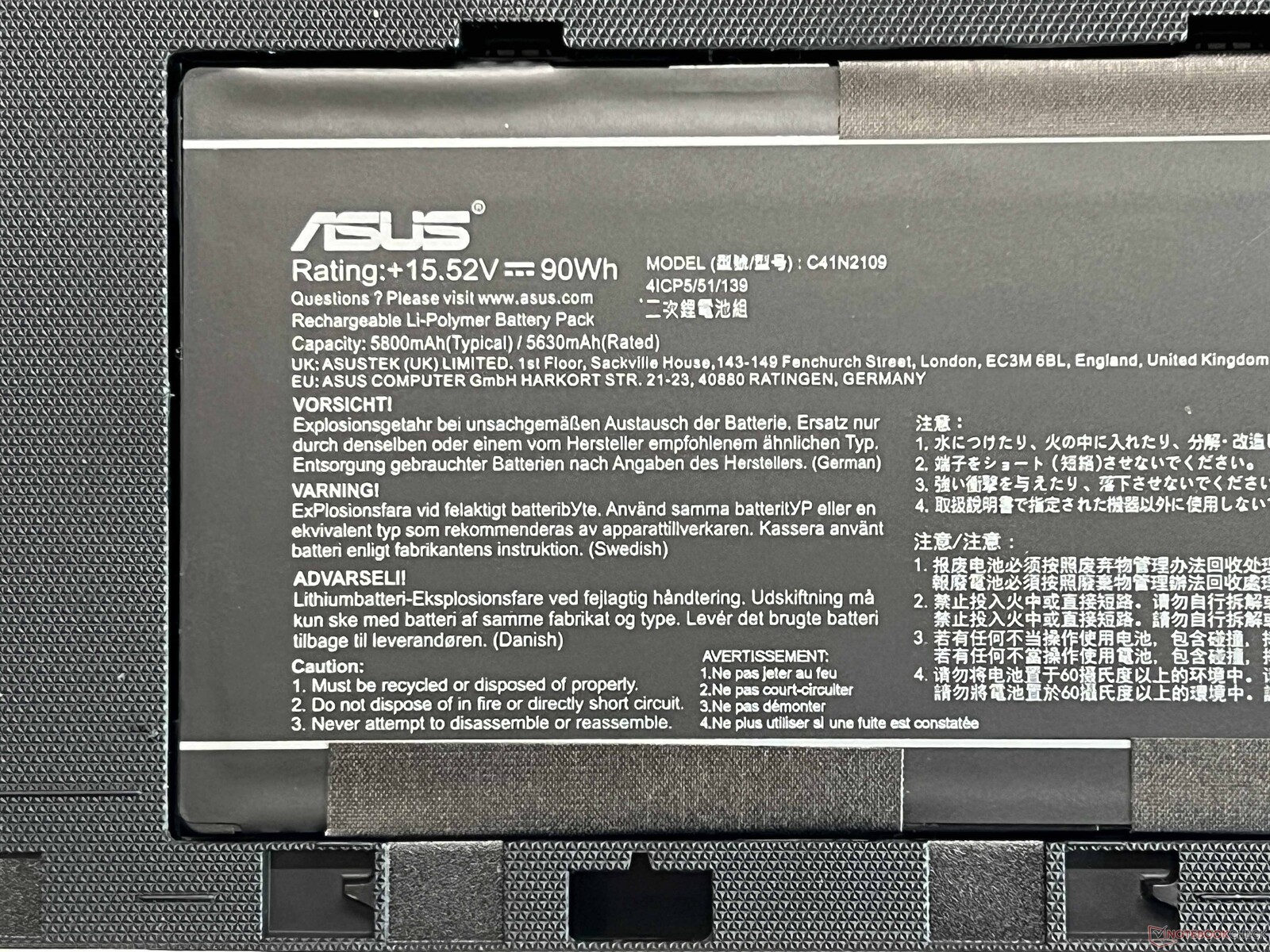 Asus znacznie ułatwił dostęp do podzespołów urządzenia. Dolną płytę bazową można odblokować za pomocą suwaka i po prostu pociągnąć do przodu. Zapewnia to dostęp do dwóch dysków SSD M.2 2280, dwóch gniazd SO-DIMM i wentylatorów. Wymiana przykręconej baterii wymaga dalszego demontażu.