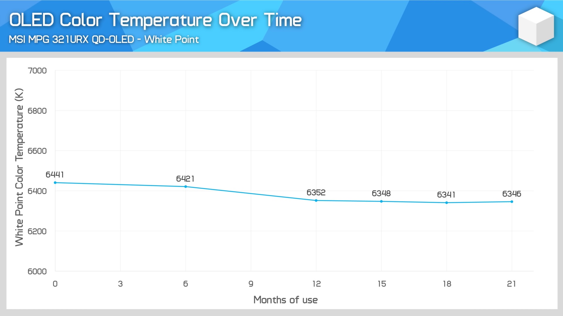 Podobnie jak w poprzedniej aktualizacji, najbardziej widocznymi artefaktami są nadal te spowodowane przez pasek zadań Windows, linię graniczną oddzielającą dwie aplikacje obok siebie oraz wypalenia po prawej stronie, gdzie umieszczono najczęściej używaną aplikację statyczną. Podobnie jak w przypadku 18-miesięcznej aktualizacji, MU donosi również, że wydaje się, że zielone subpiksele uległy najgorszemu pogorszeniu, a następnie niebieskie, a następnie czerwone subpiksele. Jednak temperatura barwowa monitora MSI MPG 321URX QD-OLED do gier oparła się dalszym odchyleniom.