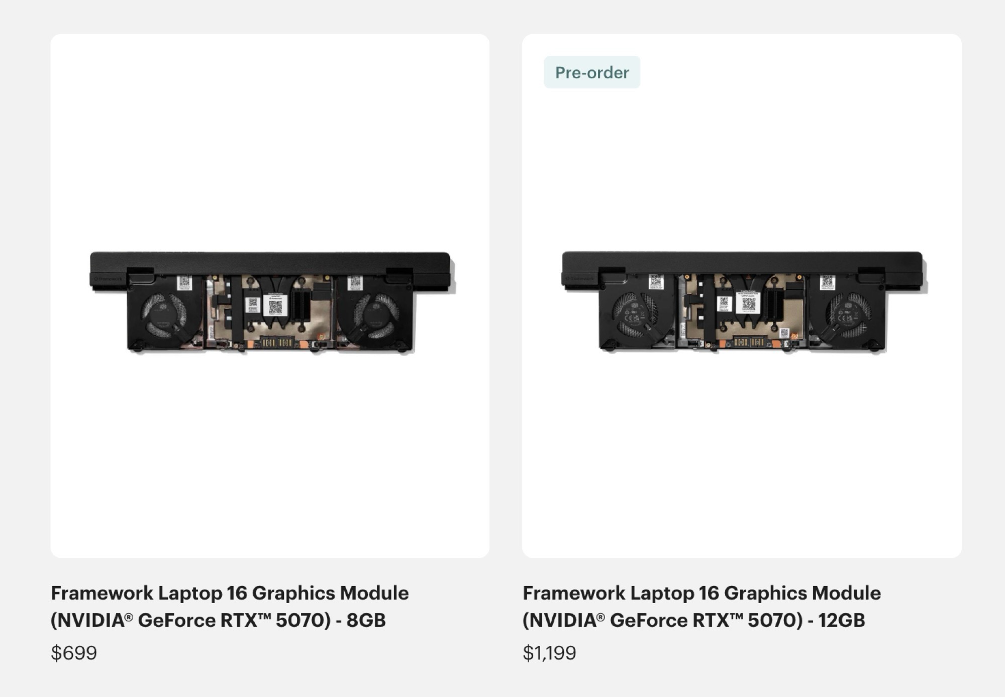 Pierwsze laptopy do gier z tą nową wersją GeForce RTX 5070 mają zacząć być dostarczane w nadchodzących tygodniach, ale Nvidia nie ogłosiła oficjalnie ceny. Framework otworzył już zamówienia przedpremierowe na moduł aktualizacyjny GeForce RTX 5070 12 GB dla Framework Laptop 16, który ma być dostarczany od czerwca. Cena jest zaskakująco wysoka - GeForce RTX 5070 12 GB kosztuje 1199 USD zamiast 699 USD jak wariant z 8 GB pamięci graficznej. Oznacza to, że klienci dopłacają 500 dolarów lub 71,5 procent za 4 GB lub 50 procent więcej pamięci VRAM.