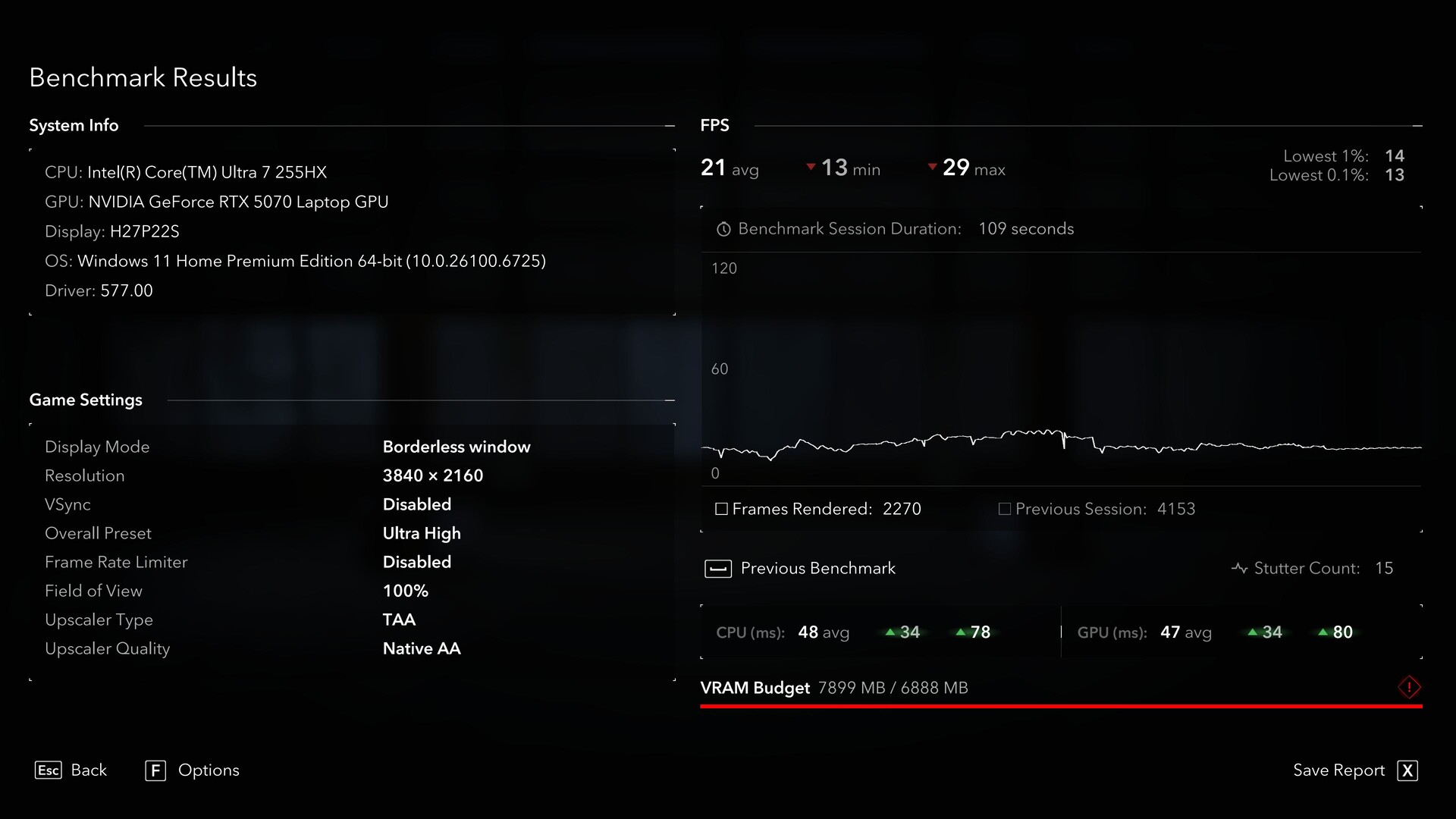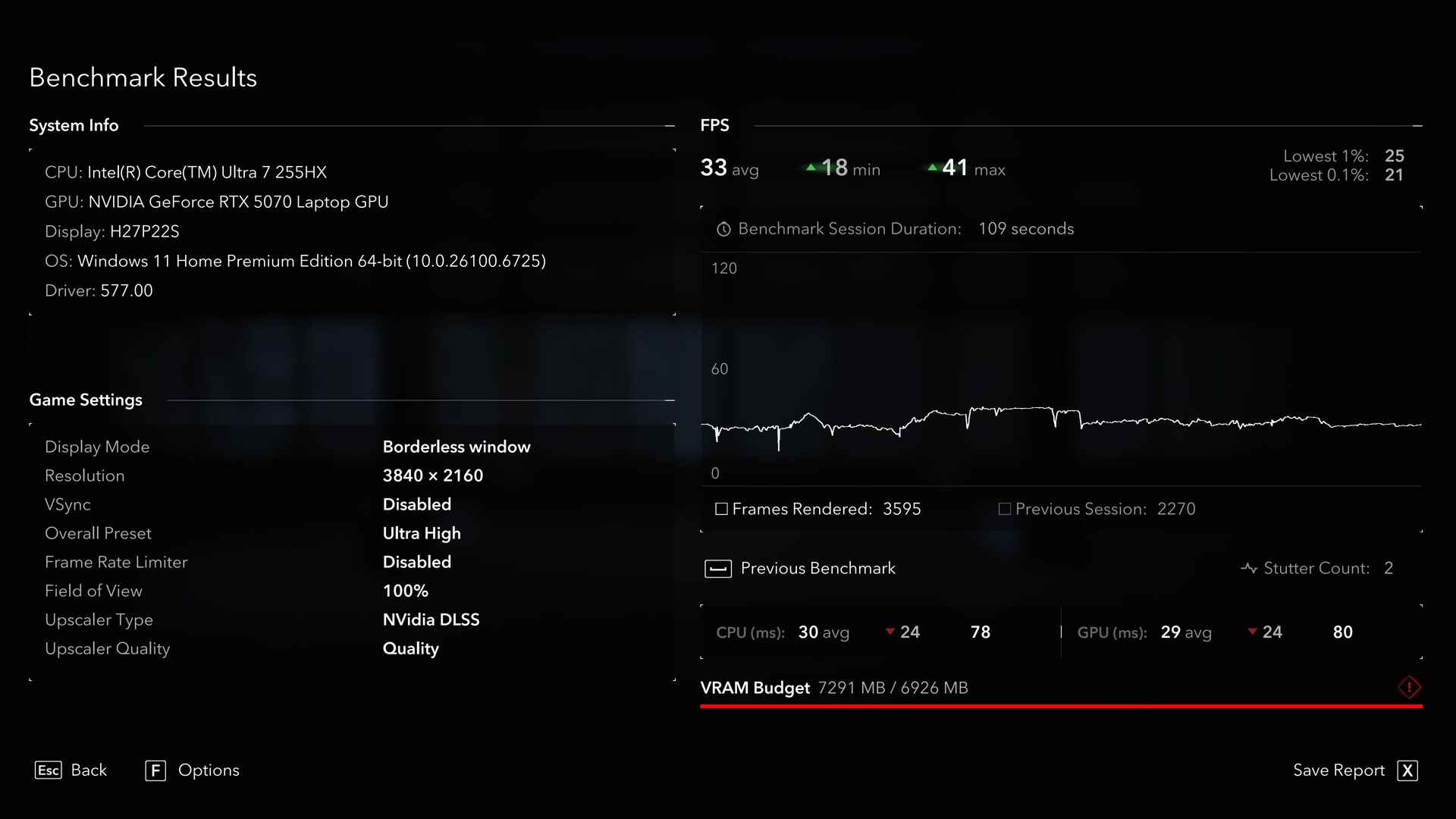 W Assassin's Creed Shadows w rozdzielczości 2560 x 1440 (QHD) gra zgłasza przekroczenie budżetu pamięci VRAM o około 100 MB. W poniższym teście porównawczym czasy klatek pozostają jednak stabilne - nawet jeśli średnia liczba klatek na sekundę oscyluje wokół 38 fps. Wewnętrzny wskaźnik zacinania się wynosi zaledwie 1.