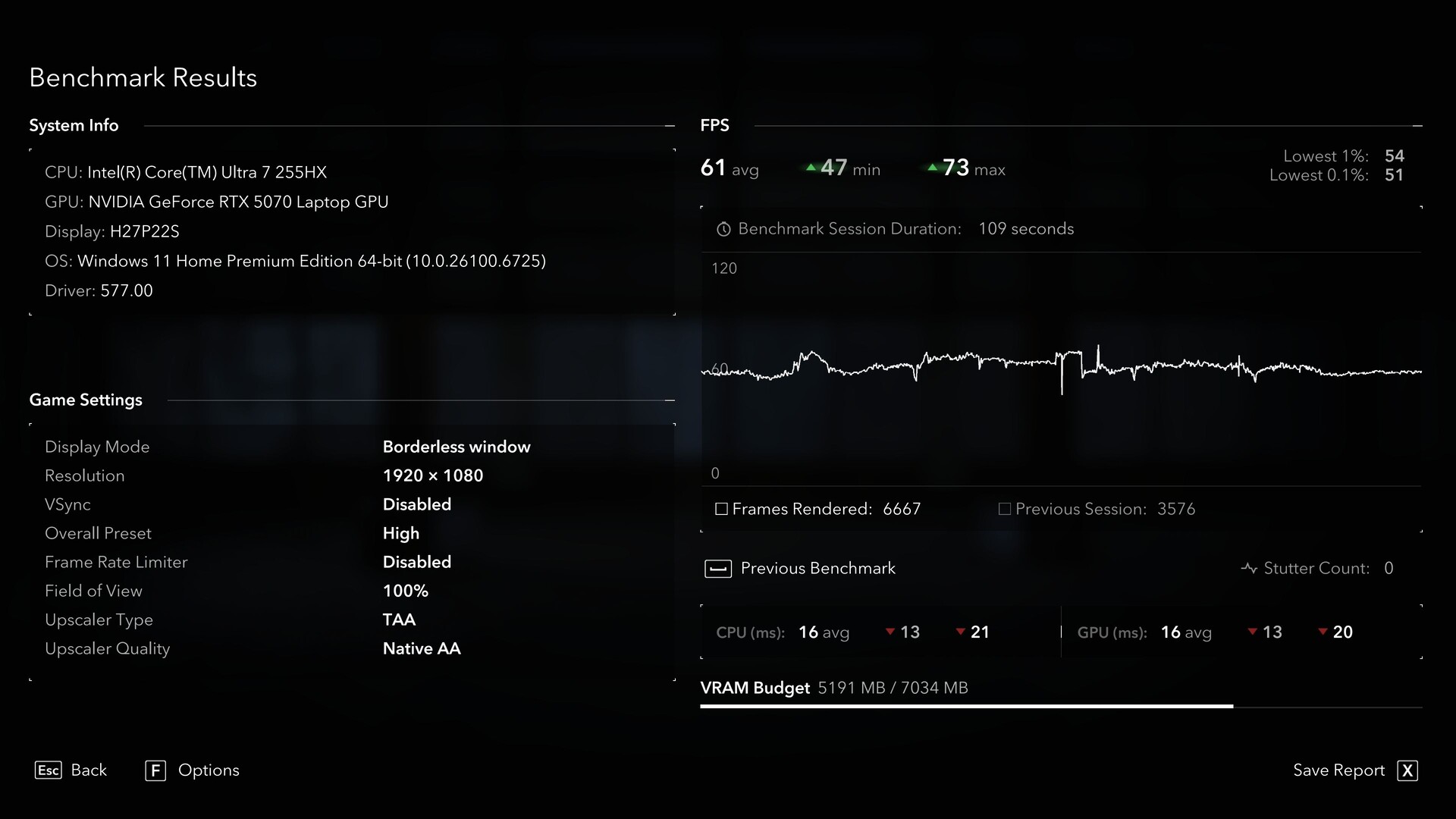 Przełączenie z natywnego 4K na tryb jakości DLSS przywraca średnią powyżej 30 klatek na sekundę i zmniejsza liczbę zacięć do 2 - ponownie, mimo że gra nadal zgłasza nadmiar pamięci VRAM. W Full HD na wysokich ustawieniach limit VRAM nie jest w ogóle przekraczany, liczba zacinania się wynosi 0, a średnia wydajność to 61 kl. Krótko mówiąc, Assassin's Creed Shadows nie jest najlepszym testem do oceny wystarczalności pamięci VRAM, ponieważ ograniczenia wydajności pojawiają się na długo przed tym, jak użycie pamięci staje się prawdziwym problemem. W związku z tym jest to również mniejszy problem.