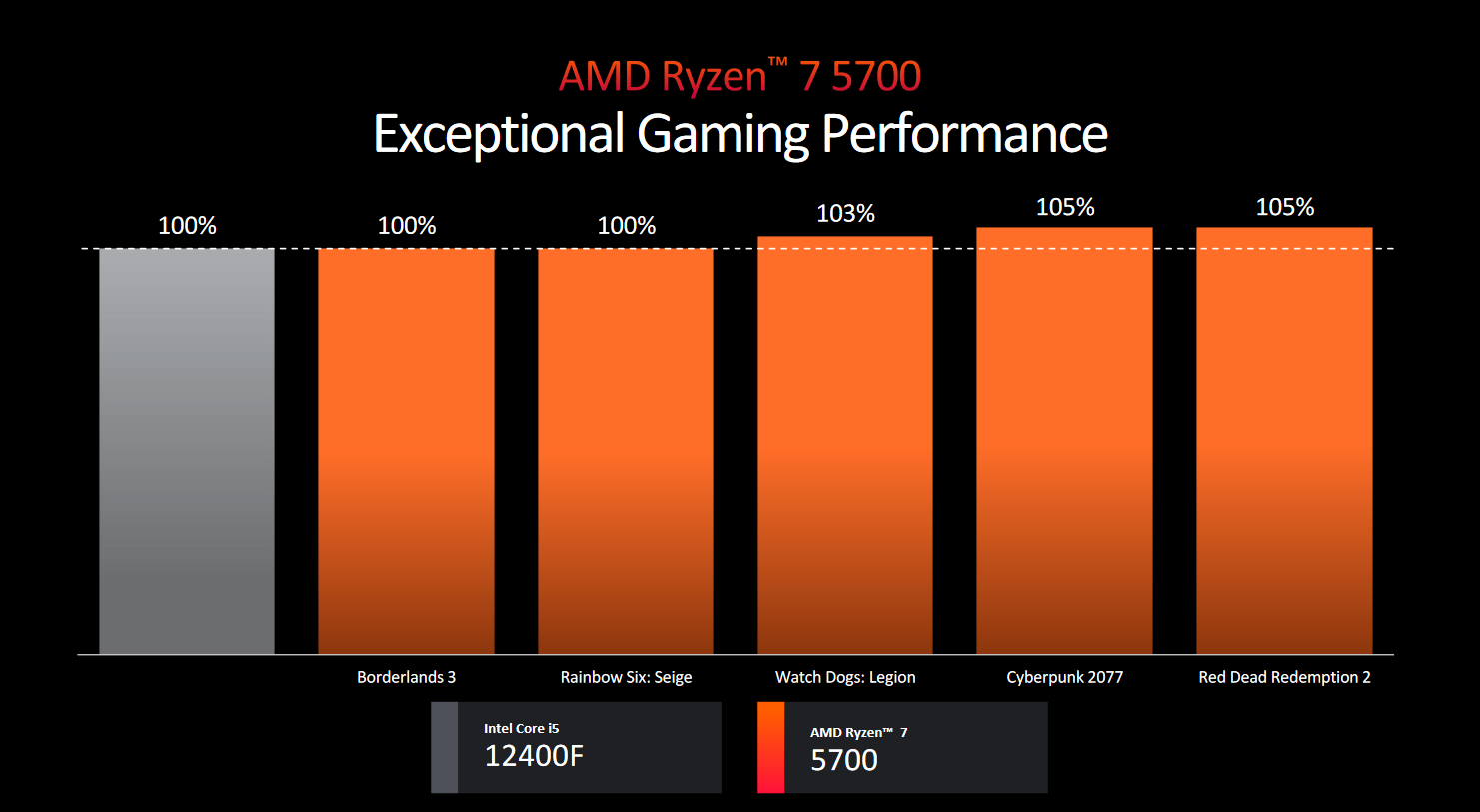 Kolejnym procesorem Zen 3, który AMD ma dla nas w zanadrzu, jest Ryzen 7 5700, który jest dokładnie tym, co sugeruje jego nazwa: rozwodnionym Ryzen 7 5700X. Podczas gdy jego zegary bazowe / boost są identyczne (4,6 / 3,7 GHz), jego całkowita pamięć podręczna została obniżona do 20 MB (z 36 MB). Z jakiegoś powodu nie obsługuje on również urządzeń PCIe Gen 4. Wreszcie, podobnie jak inne odpowiedniki Zen 3, nie zawiera iGPU. Wewnętrzne testy AMD twierdzą, że Ryzen 7 5700 może przewyższyć Intel Core i5-12400F o 5% w niektórych tytułach w połączeniu z nieuchwytnym "GeForce GTX 4080".