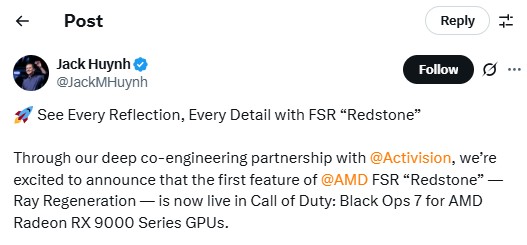 Osobno, dyrektor wykonawczy AMD, Jack Huynh, opublikował w serwisie X informację, że funkcja FSR "Redstone" Ray Regeneration jest już dostępna w Call of Duty: Black Ops 7 dla procesorów graficznych AMD Radeon serii RX 9000, obiecując, że w przyszłości pojawi się jej więcej.
