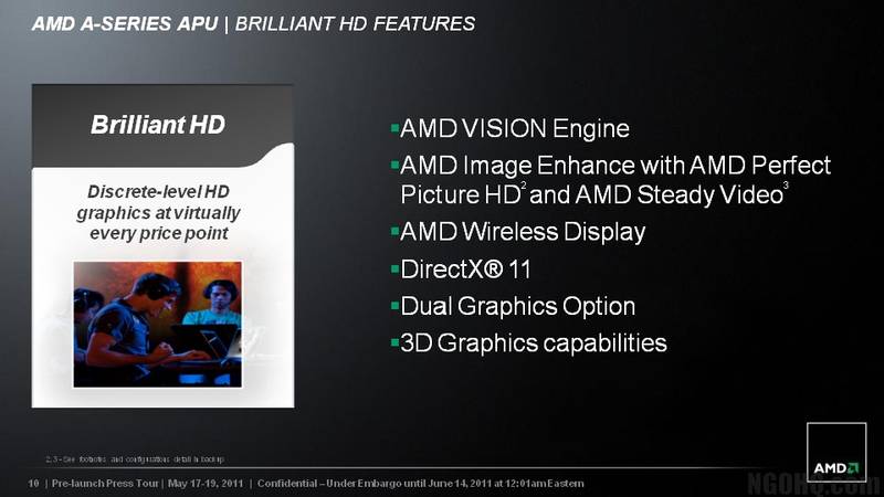 | A6-3400M | 4 | 1,4-2,3 GHz | 4 MB | Radeon HD 6520G | 320 | 400 MHz | 35 W |
