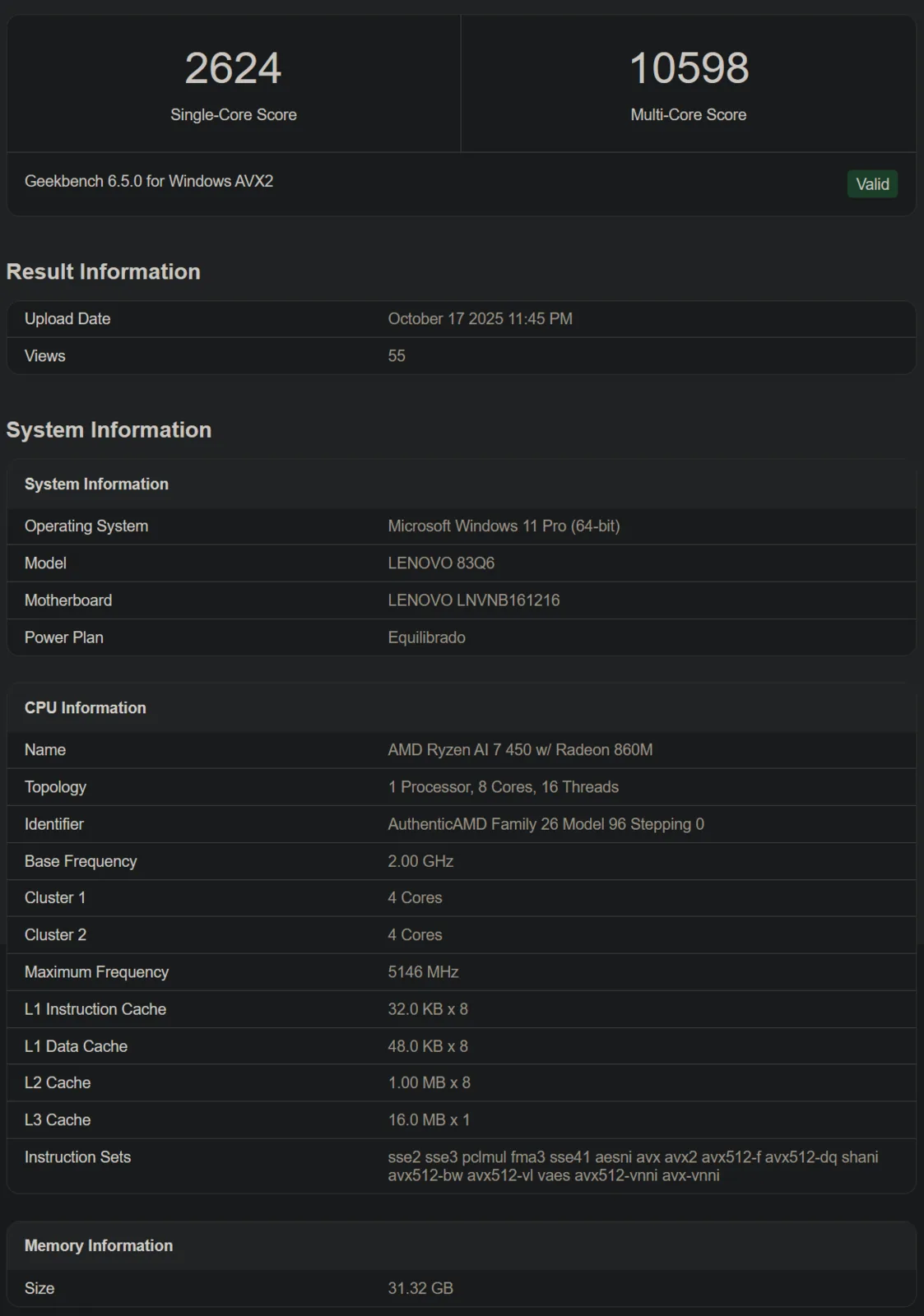 Niestety, Ryzen AI 7 450 nie wypada lepiejz jedno- i wielordzeniowymi wynikami wynoszącymi odpowiednio 2 624 i 10 598. Dla kontrastu Ryzen AI 7 350 pokazał się obok tego samego laptopa Lenovo wspomnianego powyżej z 32 GB pamięci systemowej. Pod względem specyfikacji jest to układ 4+4, z klastrem Zen 5 zwiększającym taktowanie do 5,14 GHz.
