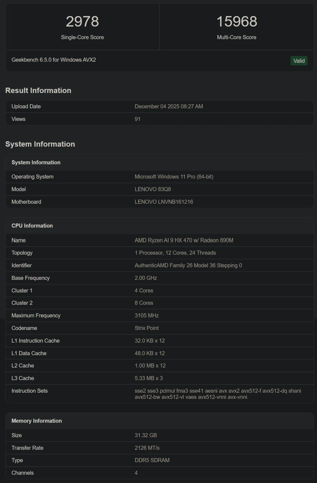 Zaczynając od flagowego Ryzena AI 9 HX 470, uzyskał on wyniki 2,978 i 15,968 w testach Geekbench w testach jedno- i wielordzeniowych. To mniej więcej tyle samo, co Ryzen AI 9 HX 370 (2,890/15,051), ale nie wskazuje to na wydajność procesora Gorgon Point, ponieważ nie jest on konsekwentnie zwiększany do maksymalnej prędkości (5,3 GHz). Został on przetestowany wraz z niewydanym laptopem Lenovo z 32 GB pamięci RAM DDR5-2126, co prawdopodobnie wpływa na ogólny wynik Geekbench.