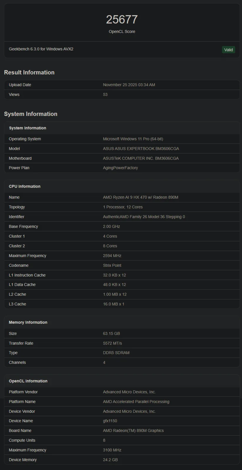Możemy również rzucić okiem na kartę graficzną Ryzen AI 9 HX 470 Radeon 890M iGPU. Uzyskał on wynik 25 677 punktów w teście Geekbench OpenCL. Po raz kolejny nie udało mu się prześcignąć tego samego GPU w swoim odpowiedniku Strix Point (39 622) pomimo nieznacznie wyższego taktowania boost (3,1 GHz vs 2,9 GHz). Ta próbka Radeona 890M pojawiła się wraz z laptopem Asus z 64 GB pamięci DDR5-5572.