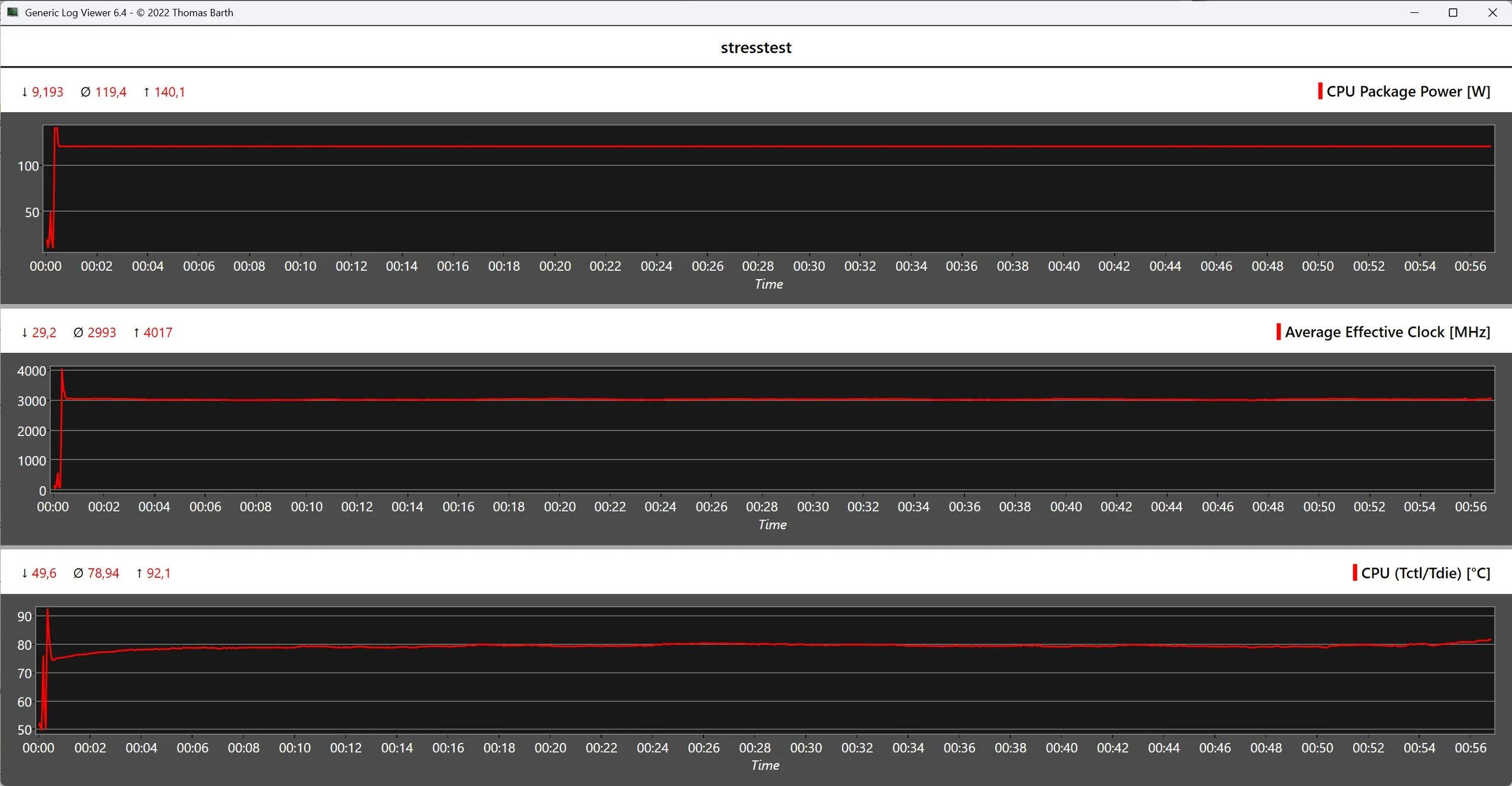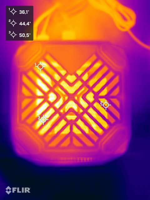 Pod obciążeniem obudowa Acemagic M1A Pro+ nagrzewa się jedynie umiarkowanie. Ze względu na konstrukcję chłodzenia, tył nagrzewa się zauważalnie, cieplej niż wszystkie inne strony, chociaż nie występują tu ekstremalne punkty gorąca. Sam procesor tylko na chwilę nagrzewa się do ponad 90°C, gdy pobór mocy wynosi do 140 W. Następnie temperatura się stabilizuje. Następnie temperatura APU stabilizuje się na poziomie około 79 °C.