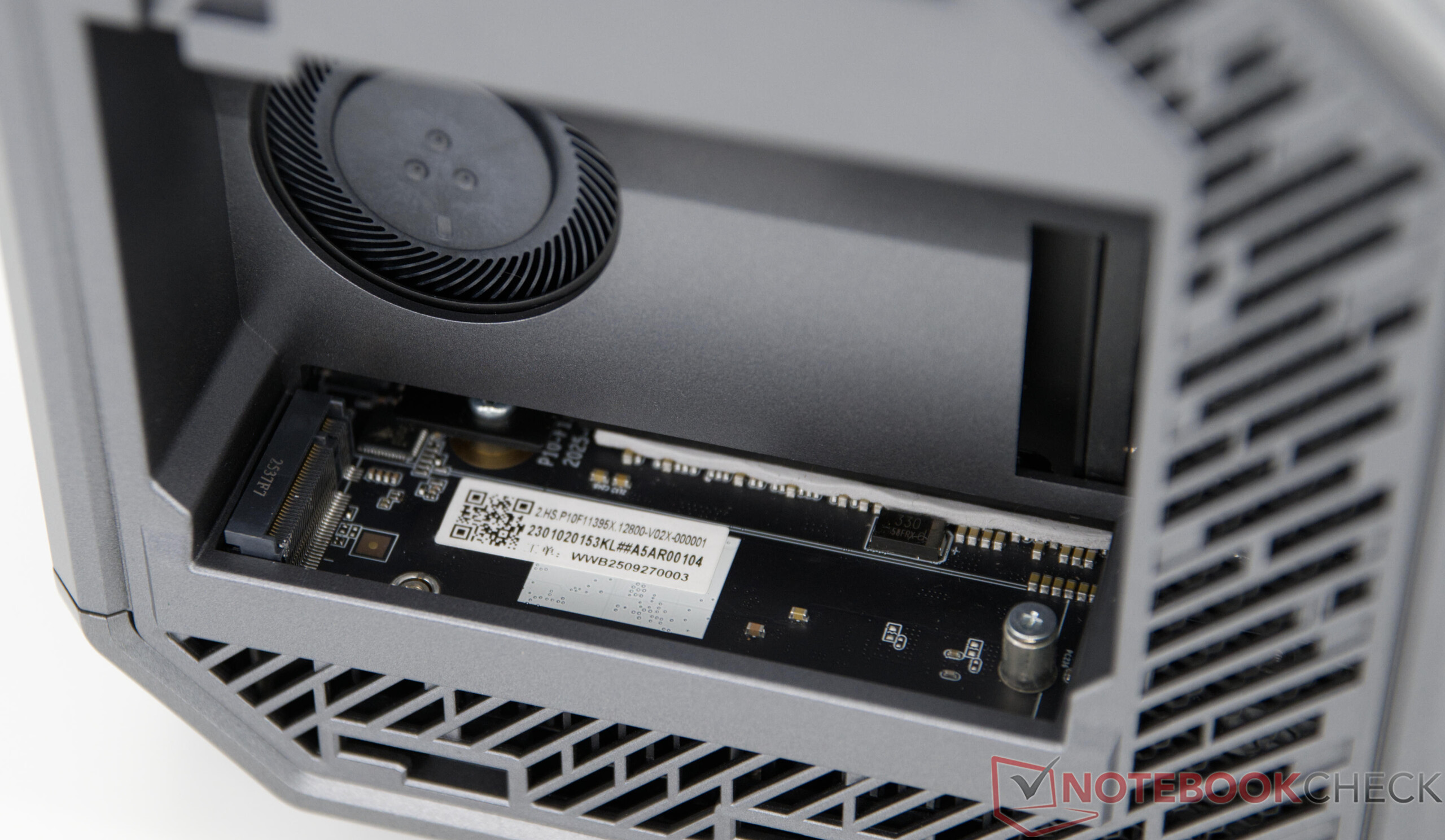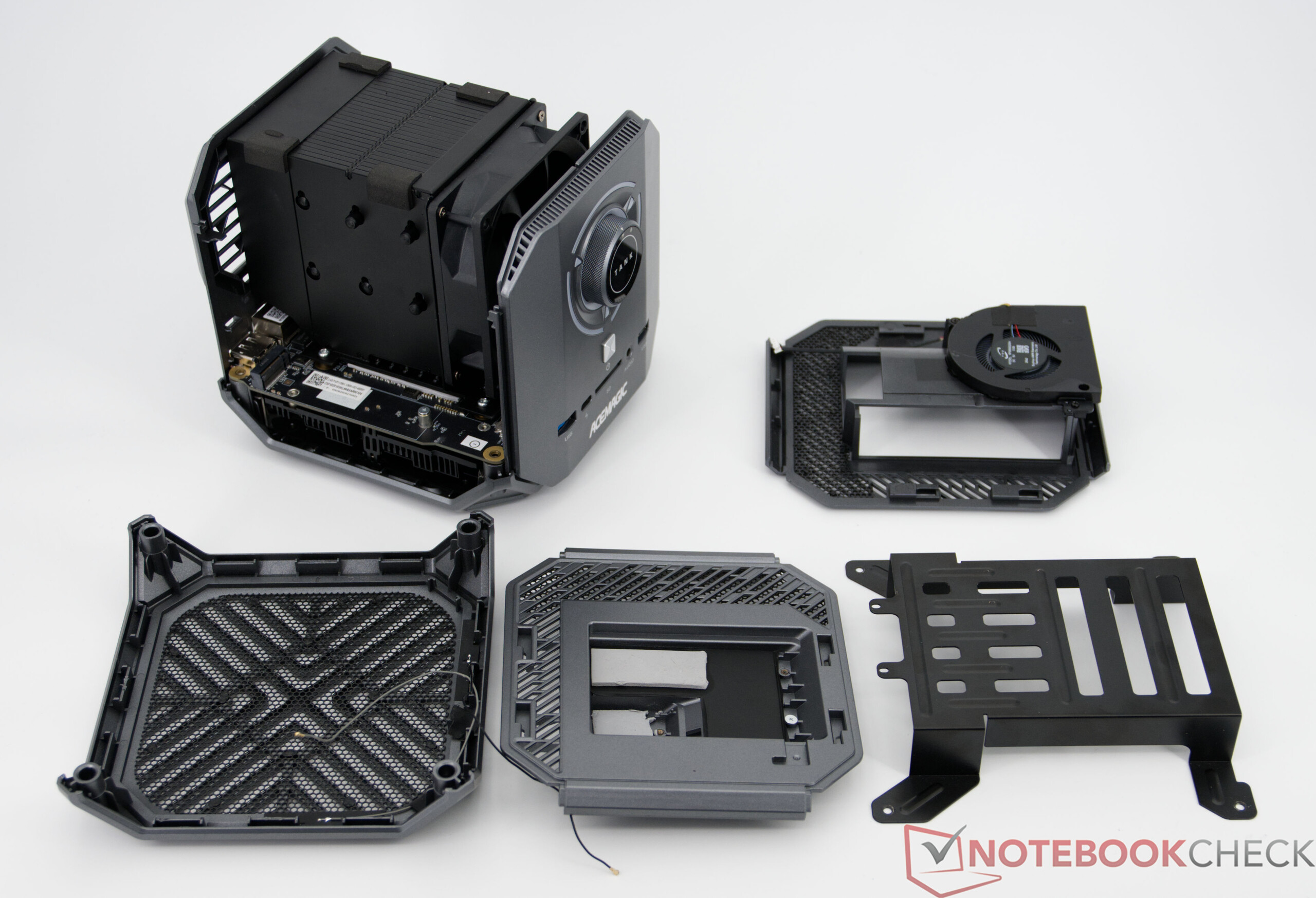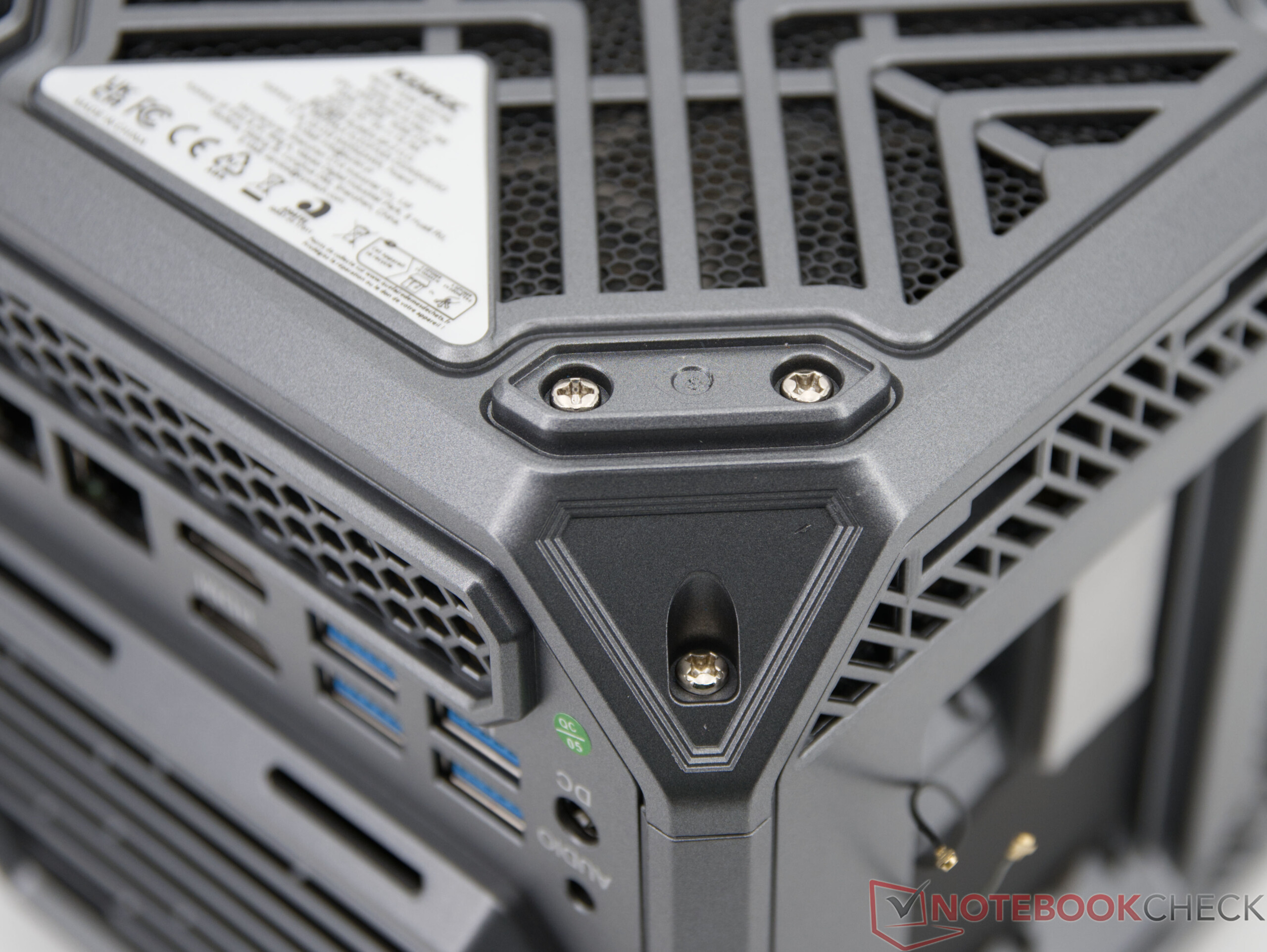 Acemagic M1A Pro+ posiada z boku dwie klapki serwisowe, które można otworzyć bez użycia narzędzi i które umożliwiają bezpośredni dostęp do dysku SSD i modułu WLAN. W naszym urządzeniu testowym są jeszcze dwa wolne sloty M.2. Istnieje możliwość całkowitego demontażu obudowy, choć jest to bardzo skomplikowane. Wiele śrubek znajduje się pod przyklejonymi osłonami narożników, które bardzo trudno zdemontować bez spowodowania uszkodzeń. Dlaczego producent utrudnia pełny dostęp do wnętrza jest niezrozumiałe - szczególnie w kontekście ewentualnych prac konserwacyjnych, takich jak czyszczenie czy wymiana wentylatora.
