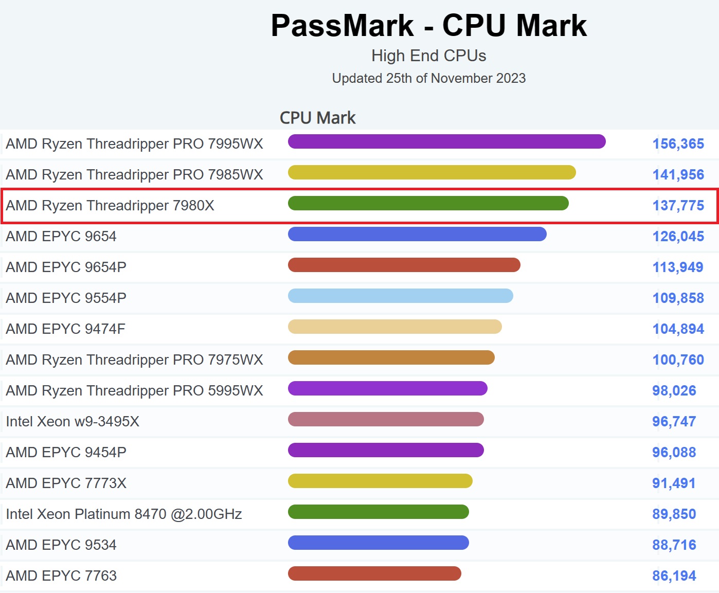 Nie tak dawno temu, Threadripper PRO 7000 z serii Threadripper trafiły do PassMark i z łatwością objęły prowadzenie w tabeli benchmarku CPU Mark. Teraz pojawił się bardziej zorientowany na sprzedaż detaliczną AMD Ryzen Threadripper 7980X, który pozostawił po sobie ślad, jakiego należy oczekiwać od high-endowego układu desktopowego (HEDT) Team RED, który ma do dyspozycji 64 rdzenie i 128 wątków Zen 4. 7980X uzyskał wynik 137 775 punktów, co wystarczyło do zajęcia trzeciego miejsca w aktualnym rankingu CPU Mark i znacznie wyprzedził wszystko, co jest związane z procesorami Xeon.
