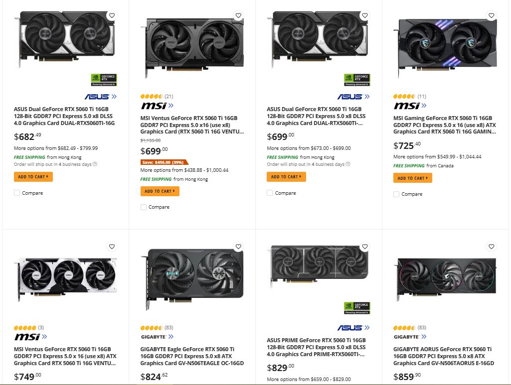 Na przykład, większość RTX 5070 Ti AIB na Newegg kosztuje obecnie znacznie więcej niż sugerowana cena detaliczna 749 USD. To samo dotyczy modeli RTX 5060 Ti 16 GB. Na szczęście RX 9070 i RX 9070 XT są nadal sprzedawane w rozsądnych cenach.