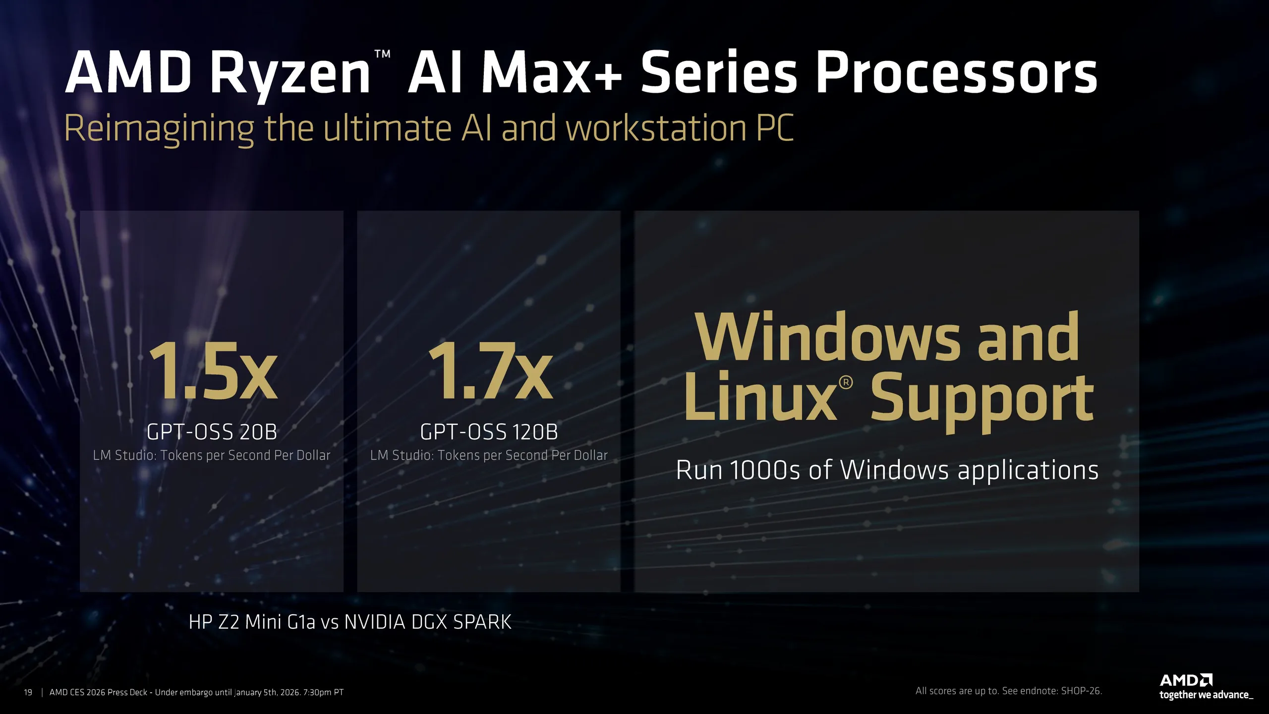 Jeśli chodzi o wydajność, AMD twierdzi, że Ryzen AI Max+ oferuje 1,5x i 1,7x wyższy token na sekundę w przeliczeniu na dolara w LM Studio przy użyciu modelu GPT-OSS 20B i GPT-OSS 120B, odpowiednio, z HP Z2 Mini G1a za 2500 USD z Ryzen AI Max+ 395 w porównaniu do Nvidia DGX Spark za 4000 USD, oba z 128 GB zunifikowanej pamięci.