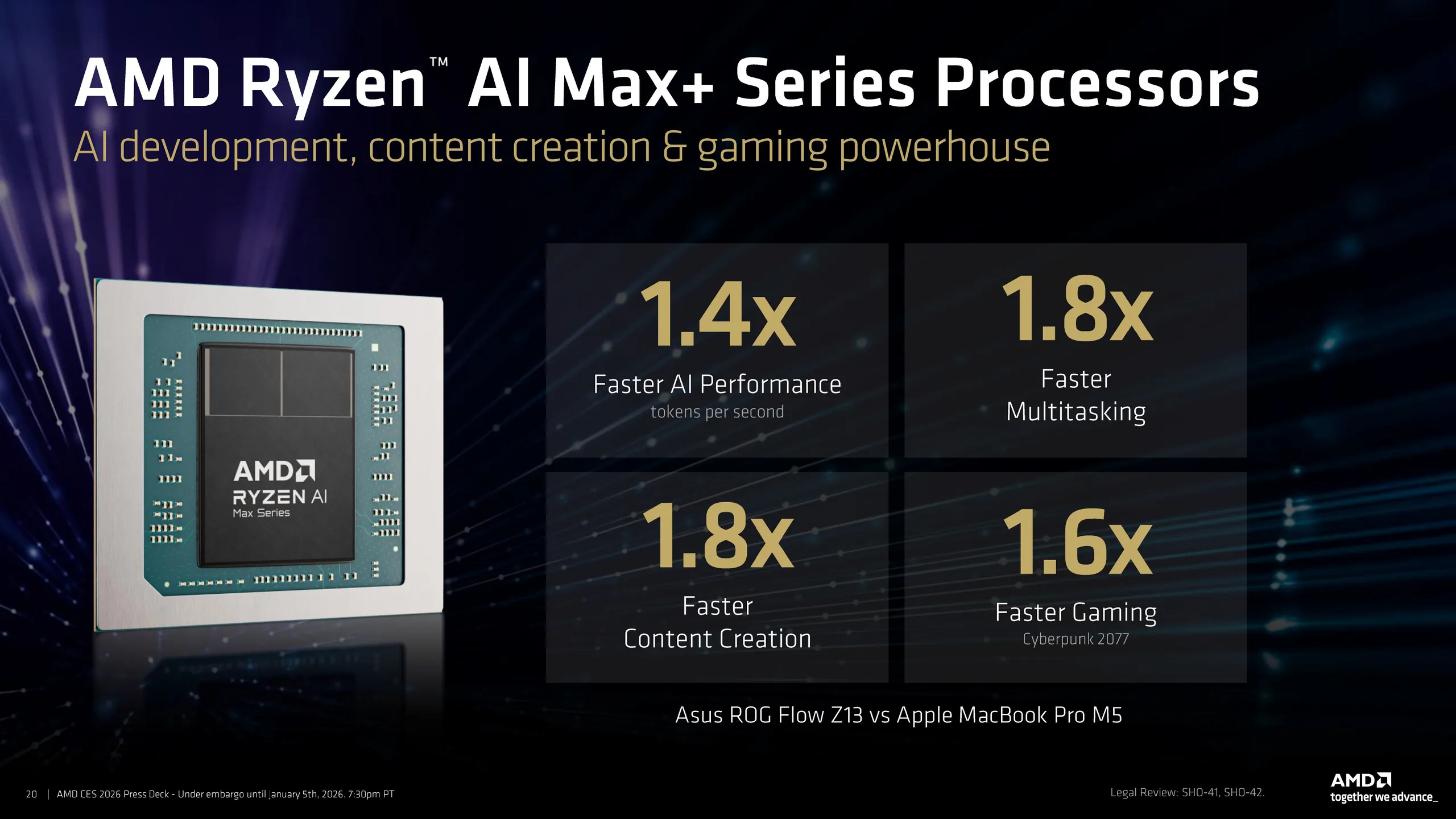 AMD twierdziło również, że wydajność sztucznej inteligencji jest 1,4x wyższa, wielozadaniowość i tworzenie treści 1,8x szybsze, a gry 1,6x szybsze dzięki Asusowi ROG Flow Z13 zasilanemu przez Ryzen AI Max+ 395 działającemu przy 55 W (profil cichy) w porównaniu z Apple MacBook Pro 14 z 10-rdzeniowym układem M5 (profil zrównoważony) i 24 GB pamięci RAM.