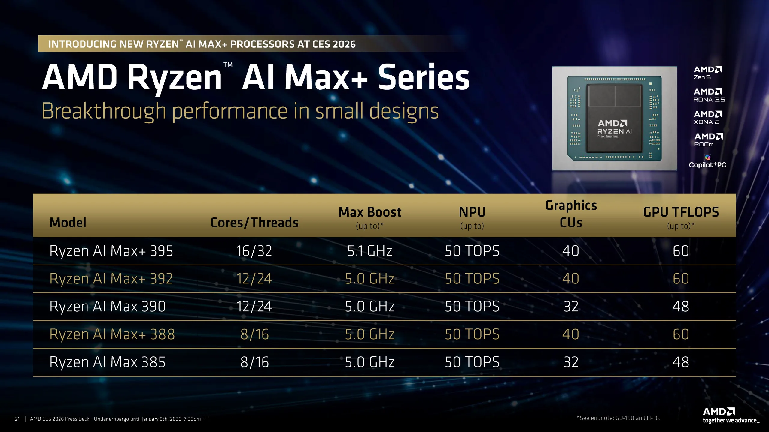 Na targach CES 2026 AMD zaprezentuje dwie nowe jednostki SKU w linii Ryzen AI Max+ - Ryzen AI Max+ 392 i Ryzen AI Max+ 388 przeznaczone dla programistów AI.