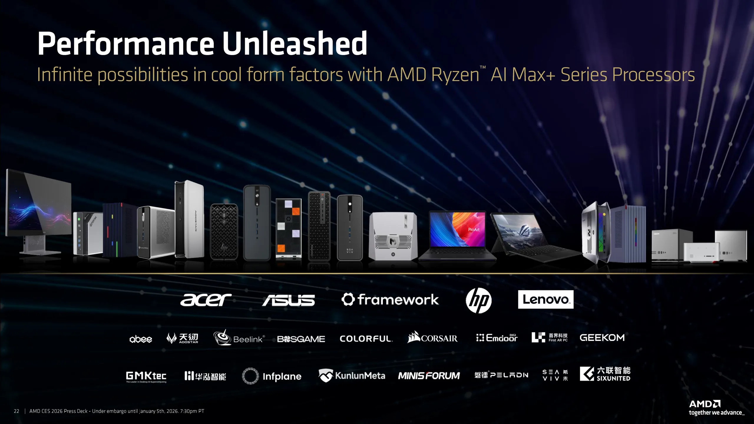 Nowe konstrukcje laptopów zasilane przez procesory APU Ryzen AI Max+ będą dostępne od firm Acer, Asus, Framework, HP i Lenovo. Widzieliśmy również handheldy do gier, takie jak GPD Win 5 zasilany przez Strix Halo z systemem Windows 11 i SteamOS.
