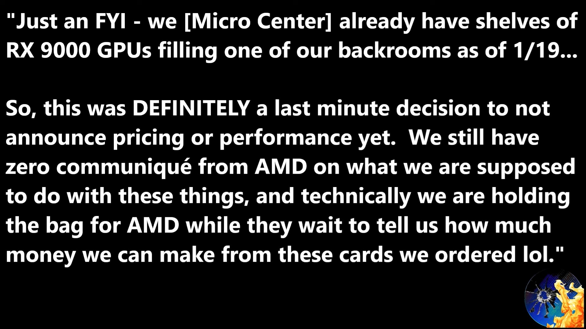 Sprawa wygląda na tę drugą, ponieważ Moore's Law is Dead twierdzi, że Micro Center ma już w swoich zapasach procesory graficzne RX 9000. Przeciek ujawnia, że Micro Center najwyraźniej ma "półki z procesorami graficznymi RX 9000" wypełniające jedno z zapleczy sprzedawcy. Team Red rzekomo pozostawił Micro Center "trzymając torbę", jednocześnie powstrzymując się od przekazywania informacji o cenach.