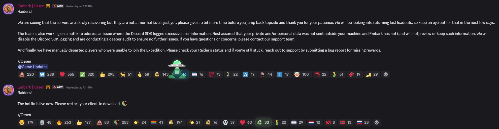 Wkrótce po tym, jak sprawa stała się publiczna, Embark Studios odpowiedziało i potwierdziło, że Discord SDK zarejestrował więcej informacji o użytkowniku niż zamierzano. Studio zapewniło graczy, że dane nigdy nie zostały przesłane poza komputer użytkownika, a deweloperzy nigdy nie uzyskali dostępu do wiadomości ani ich nie przechowywali. Wydano również poprawkę, która wyłącza problematyczne rejestrowanie. Zespół oświadczył ponadto, że przeprowadza dogłębny audyt, aby upewnić się, że podobne problemy nie pojawią się w przyszłości.