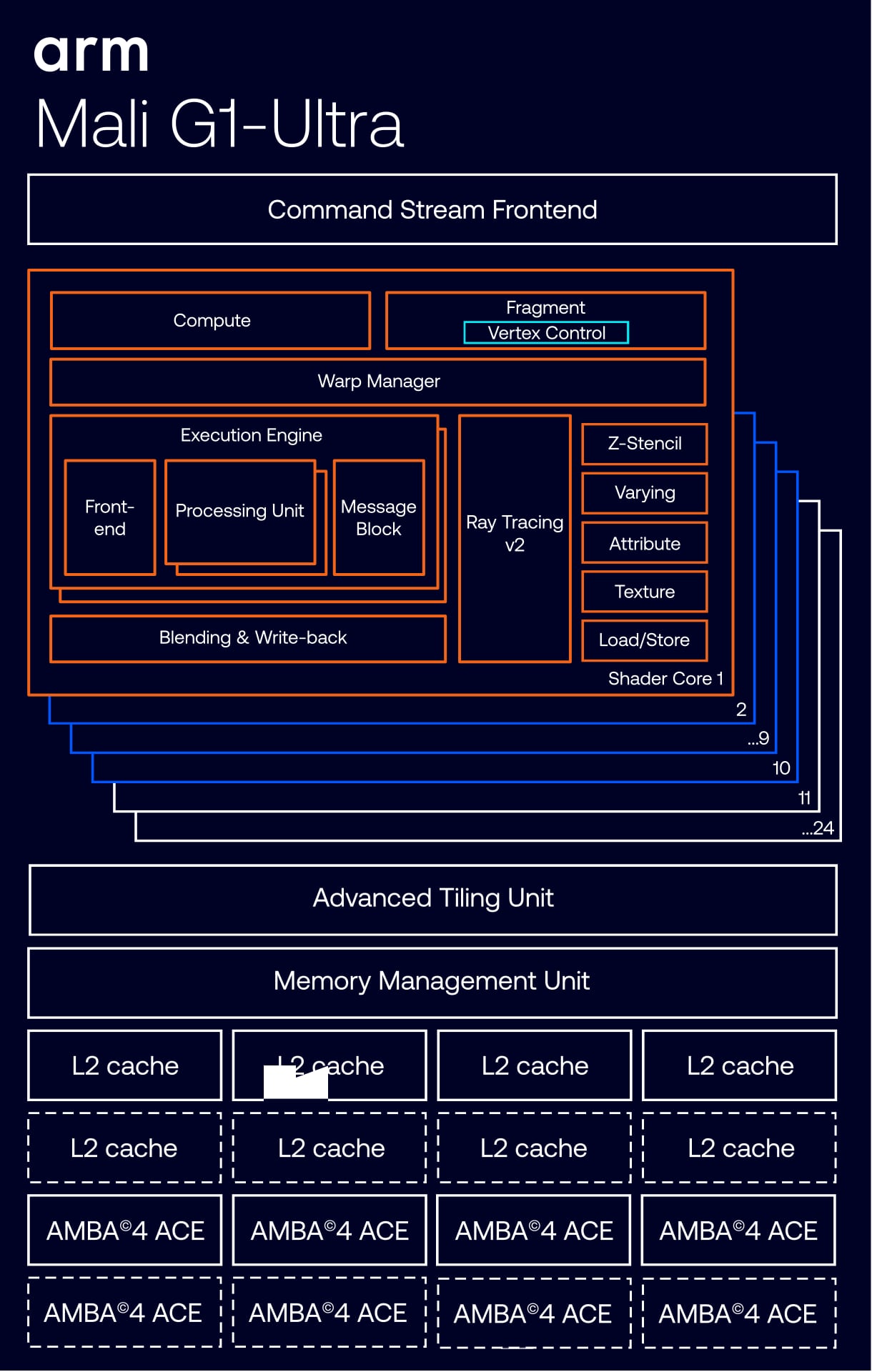 ARM Mali G1-Ultra MC12 (MP12) to wysokiej klasy procesor graficzny dla smartfonów i tabletów, który po raz pierwszy można znaleźć w tej formie w Mediatek Dimensity 9500. Wykorzystuje on 12 rdzeni i bazuje na architekturze GPU 5. generacji. Warianty Ultra zawsze obsługują ray tracing (2. generacja) i według ARM powinny oferować wydajność ray tracingu dwukrotnie wyższą niż poprzednik (Immortalis-G925).