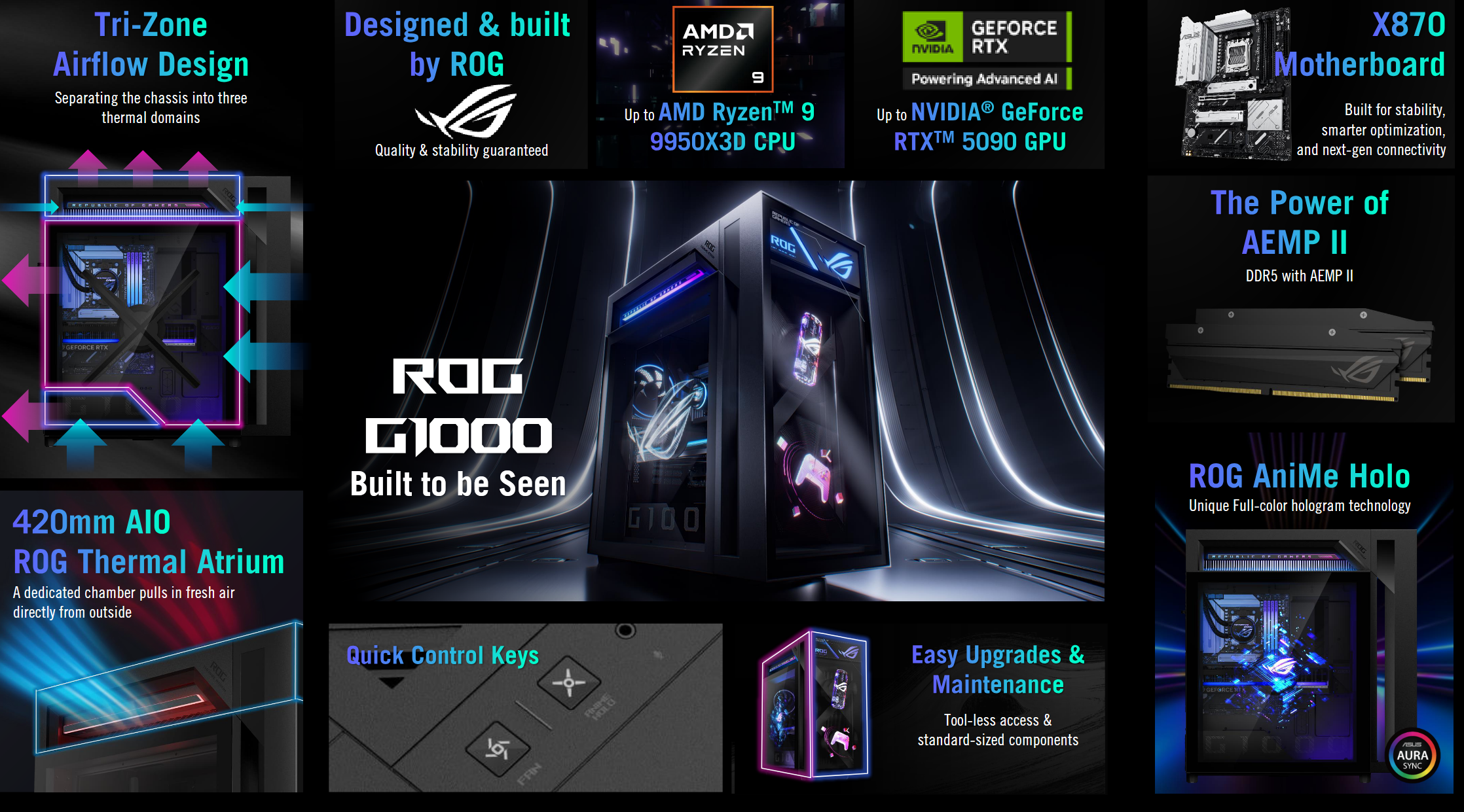 ROG G1000 obsługuje do AMD Ryzen 9 9950X3D w połączeniu z procesorami NVIDIA GeForce RTX 5090 grafiką. Asus buduje system na płycie głównej X870 zaprojektowanej przez firmę ROG. Obsługa pamięci obejmuje DDR5 z AEMP II, automatycznym dostrajaniem profilu pamięci Asusa zaprojektowanym w celu zwiększenia stabilności i wydajności bez konieczności ręcznej konfiguracji.