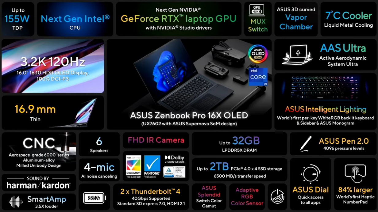 ASUS ujawnił nową wersję Zenbook Pro 16X OLED, którego ostatnią wersję recenzowaliśmy m.in w grudniu. Podczas gdy tamten model osiągnął 140 W dla swojego CPU i GPU, tegoroczna edycja osiąga szczyt 155 W. Według ASUS-a, laptop będzie dostępny z procesorem Intel Core i9-13905H oraz nieujawnionymi procesorami z serii GeForce RTX 4000, które domyślnie będą korzystać ze sterowników NVIDIA Studio.