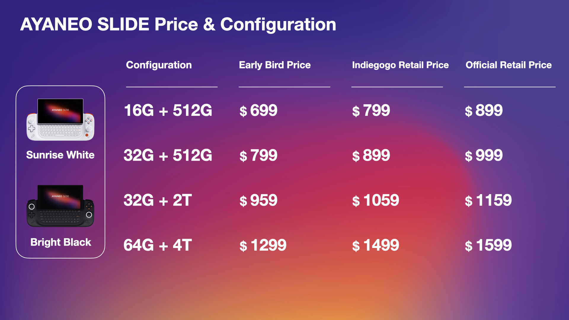 AYANEO wprowadziło na rynek cztery konfiguracje pamięci, wszystkie z pamięcią RAM LPDDR5X, pamięcią masową PCIe 4.0 i wyborem między opcjami kolorystycznymi Bright Black i Sunrise White. Obecnie AYANEO SLIDE zaczyna się od 699 USD z 16 GB pamięci RAM i 512 GB pamięci masowej, choć cena ta ostatecznie wzrośnie do 799 USD na Indiegogo, a następnie do 899 USD, gdy AYANEO zaoferuje SKU na swojej stronie internetowej. Jak pokazuje poniższy obrazek, SLIDE jest również dostępny z maksymalnie 64 GB pamięci RAM i dyskiem SSD o pojemności 4 TB w cenie 1299 USD Early Bird. Na razie firma ma nadzieję rozpocząć wysyłkę zamówień Indiegogo od przyszłego miesiąca.