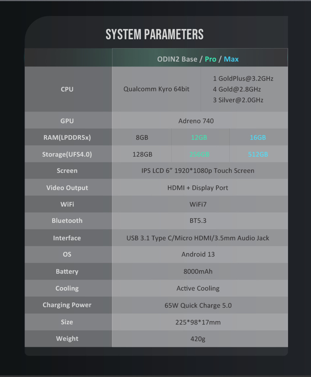 - Odin2 Max (16 GB RAM/512 GB pamięci masowej): Super Early Bird - ~408 USD (3 200 HKD) / Early Bird ~446 USD (3 499 HKD)