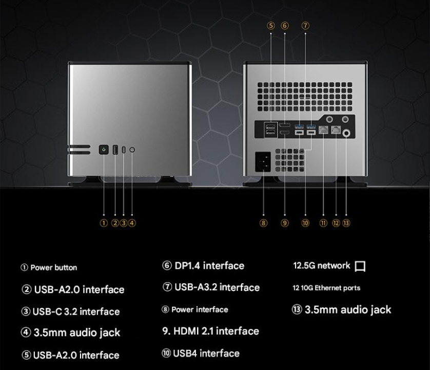 Jak pokazuje poniższy obrazek, Abee AI Station posiada liczne porty na przednim i tylnym panelu. Dodatkowo, mini-PC posiada wbudowany zasilacz o mocy 400 W. Niemniej jednak, Abee twierdzi, że AI Station mierzy zaledwie 199 x 199 x 199 mm. Jednak całkowicie aluminiowa obudowa przyczynia się do oficjalnej wagi urządzenia wynoszącej 5,3 kg.