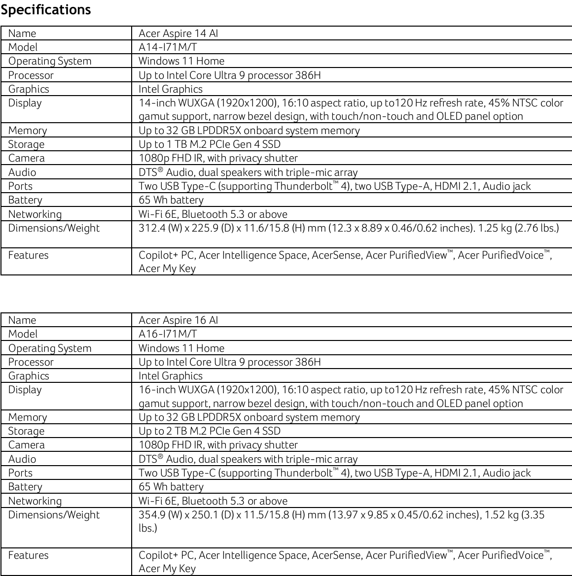 Aspire 14 AI i Aspire 16 AI to komputery Copilot+ wyposażone w procesory Intel Core Ultra 9 386H z maksymalnie 32 GB pamięci RAM LPDDR5x i dyskiem SSD M.2 NVMe o pojemności do 2 TB.