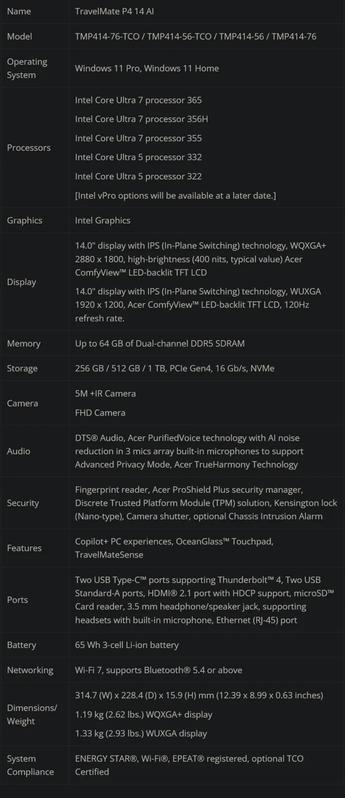 Dzięki nowej, przeprojektowanej aluminiowej obudowie, modele TravelMate P4 14 AI i TravelMate P4 Spin 14 AI są cieńsze i lżejsze w porównaniu do poprzedniej generacji. Oba warianty mogą być wyposażone w ekrany IPS o rozdzielczości 1920 x 1200 lub 2880 x 1800, czujniki linii papilarnych i podświetlane klawiatury, a także obsługę trzech zewnętrznych monitorów 4K za pośrednictwem dwóch złączy USB-C i HDMI. TravelMate P4 14 AI waży zaledwie 1,19 kg, podczas gdy TravelMate P4 Spin 14 AI jest jedynym konwertowalnym z czterech nowych modeli i jest wyposażony w rysik w garażu, a także ekran dotykowy 360 stopni.