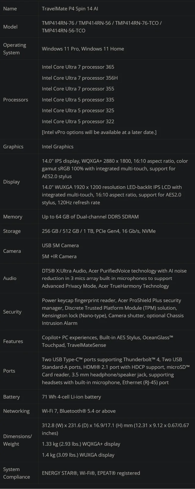 Jeśli chodzi o wybór procesora, wszystkie modele z wyjątkiem kabrioletu mogą być wyposażone w Intel Core Ultra 7 365 / 356H / 355 lub Core Ultra 5 332 / 322 procesor. TravelMate P4 Spin 14 AI może być również wyposażony w procesor Intel Core Ultra 5 335 / 325ale zrezygnowano z opcji procesora Intel Core Ultra 5 332. Pojemność pamięci RAM wzrasta do 64 GB DDR5, a opcje pamięci masowej obejmują 256 GB, 512 GB i 1 TB PCIe 4.0 NVMe SSD dla wszystkich modeli