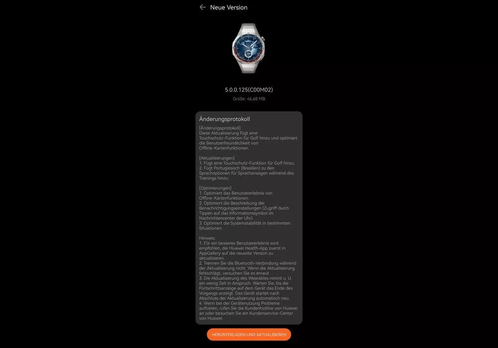 W dzienniku zmian Huawei zauważa, że dodał funkcję ochrony przed dotykiem dla golfistów. Przypuszczalnie ma to na celu powstrzymanie przypadkowych wyzwalaczy podczas gry. Ponadto podczas treningów dostępna jest teraz obsługa podpowiedzi głosowych w brazylijskim języku portugalskim. Mówi się, że wprowadzono ulepszenia w obsłudze map offline, choć dalsze szczegóły nie zostały podane. Ponadto poprawiono opisy ustawień powiadomień, które można wyświetlić po dotknięciu ikony informacji w centrum powiadomień.