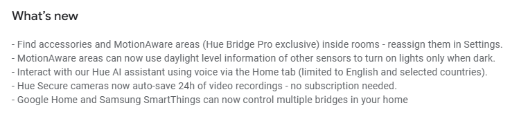 Kolejna zmiana w aplikacji Philips Hue w wersji 5.54 dotyczy asystenta Hue AI, który znajduje się na karcie Home. Asystent obsługuje teraz polecenia głosowe, choć na razie tylko w języku angielskim. Firma wskazuje również, że jest on dostępny w ograniczonej liczbie krajów, bez podawania dalszych szczegółów. Kolejna zmiana dotyczy kamery Hue Secure, która będzie teraz automatycznie i bezpłatnie zapisywać nagrania wideo z 24 godzin. Wreszcie, istnieje wsparcie dla wielu konfiguracji mostów, którymi można sterować za pośrednictwem Google Home i Samsung SmartThings.