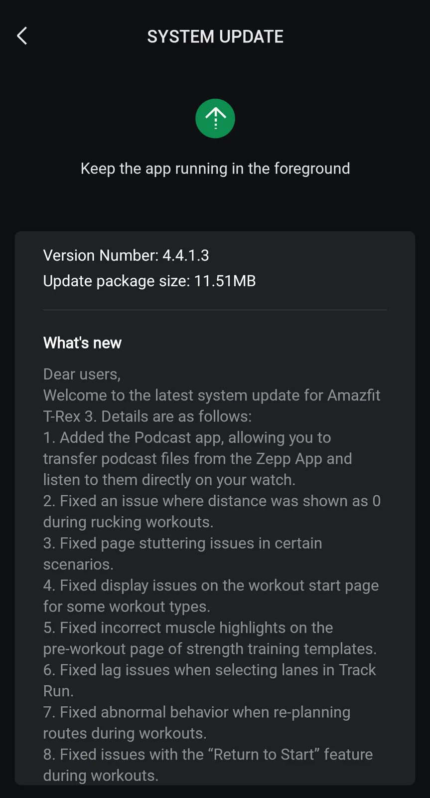 Najnowsza wersja oprogramowania układowego dla Amazfit T-Rex 3 Pro, wersja 4.4.1.3, to plik o rozmiarze 11,51 MB. Jak donosi wielu użytkowników, dodaje ona nową aplikację Podcast do tego smartwatcha, umożliwiając użytkownikom słuchanie pobranych odcinków bezpośrednio z urządzenia do noszenia. Aby to zrobić, użytkownicy będą musieli przenieść wybrane podcasty z aplikacji Zepp na smartfony.