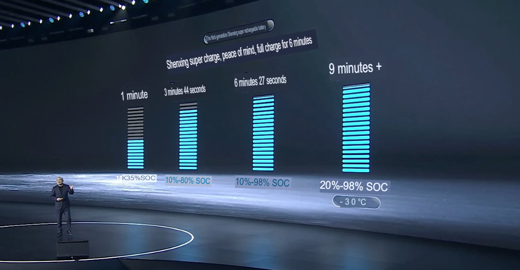 Dzięki kilku innowacjom, takim jak na przykład zwiększenie wydajności chłodzenia o 20%, akumulator Shenxing 3 LFP ładuje się z 10% do 35% w zaledwie minutę, osiąga 80% w 3 minuty i 44 sekundy oraz osiąga poziom 98% w 6 minut i 27 sekund przy stałej prędkości ładowania 10C, która według CATL może osiągnąć szczyt 15C na wczesnych etapach ładowania.