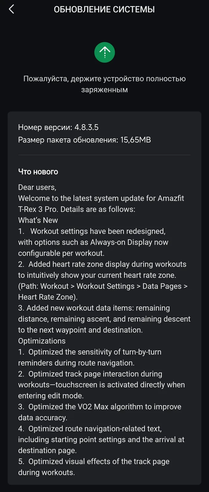 Oprogramowanie układowe w wersji 4.8.3.5 wprowadza również kilka optymalizacji do T-Rex 3 Pro. Poprawiono czułość przypomnień o zakrętach podczas nawigacji po trasie, a także wrażenia użytkownika na stronie śledzenia. Amazfit twierdzi, że zoptymalizował algorytm obliczania VO2 Max, aby uzyskać dokładniejsze informacje. Ponadto tekst związany z nawigacją po trasie został ulepszony.