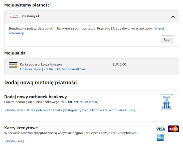 Na stronach sklepu Amazon przygotowano instrukcję jak płacić za pośrednictwem serwisu Przelewy24 (język polski).