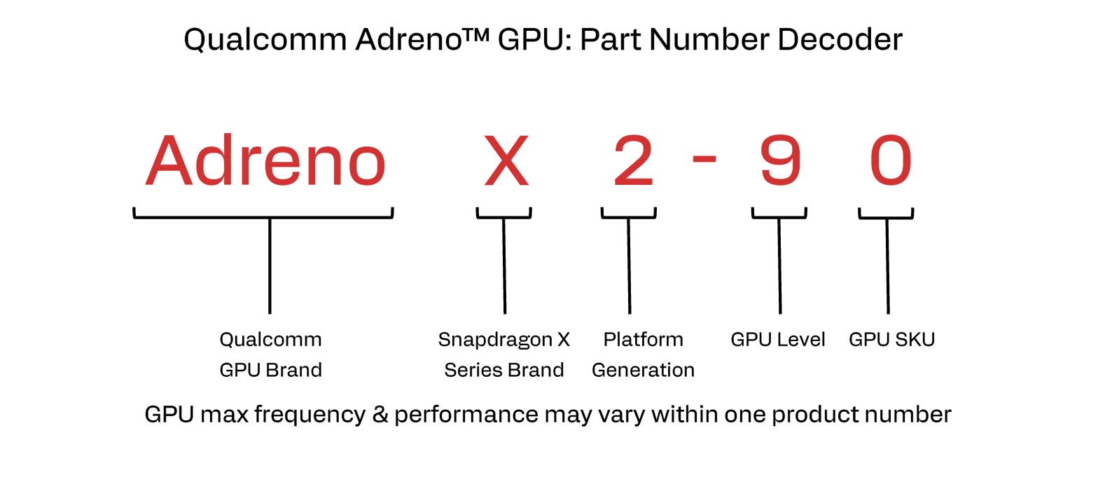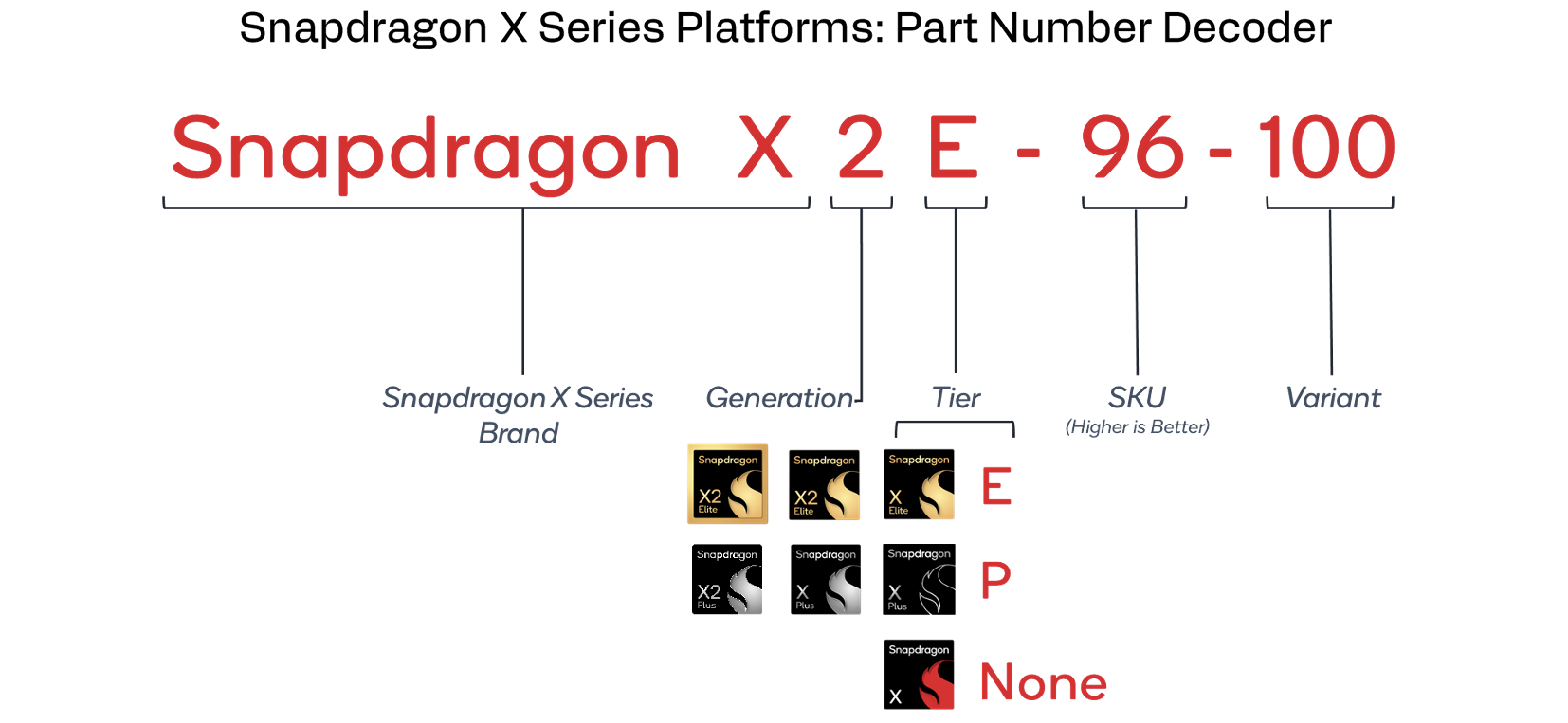 Biorąc pod uwagę liczbę dostępnych procesorów (patrz tabela poniżej), nazewnictwo to może szybko stać się mylące i nie jest idealne dla klientów. Oprócz modeli X2 Elite i X2 Elite Extreme, Qualcomm wprowadza również dwa modele X2 Plus dla urządzeń z niższej półki. Jak zawsze wydajność chipów będzie się różnić w zależności od urządzenia ze względu na różne limity mocy. Ponadto zegary GPU ponownie różnią się w zależności od modelu procesora, więc nawet jeśli dwa GPU mają tę samą nazwę (np. Adreno X2-90), zegary, a tym samym wydajność, mogą się znacznie różnić.