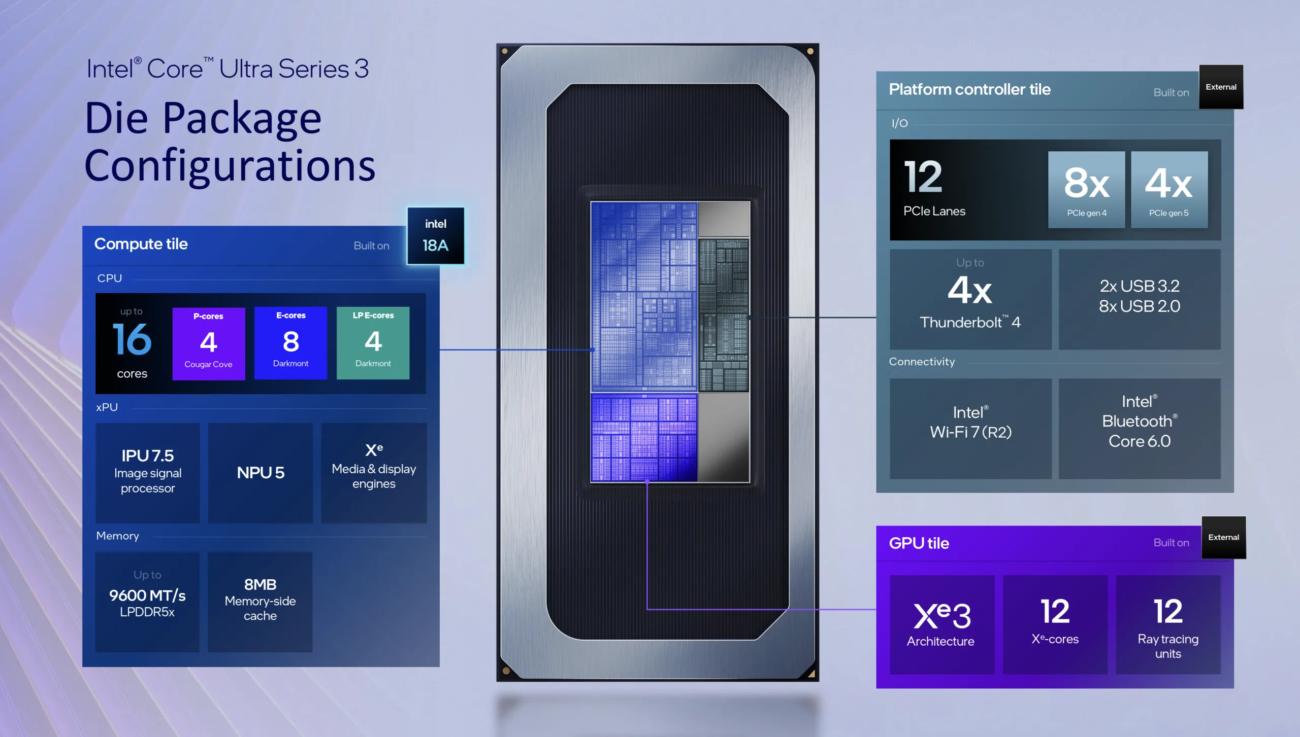 Nowe procesory mobilne Panther Lake po raz kolejny składają się z różnych kafelków, przy czym kafelek obliczeniowy jest produkowany przez samego Intela (Intel 18A). W zależności od modelu, można wykorzystać łącznie do 16 rdzeni: cztery szybkie rdzenie P (Cougar Cove), osiem rdzeni E (Darkmont) i cztery dodatkowe rdzenie E o niskim poborze mocy (Darkmont). Zainstalowano również jednostki NPU z 46-50 TOPS, co oznacza, że wszystkie procesory Panther Lake spełniają minimalne wymagania certyfikatu Microsoft Copilot+. TSMC produkuje pozostałe dwa kafelki (kontroler platformy i GPU).