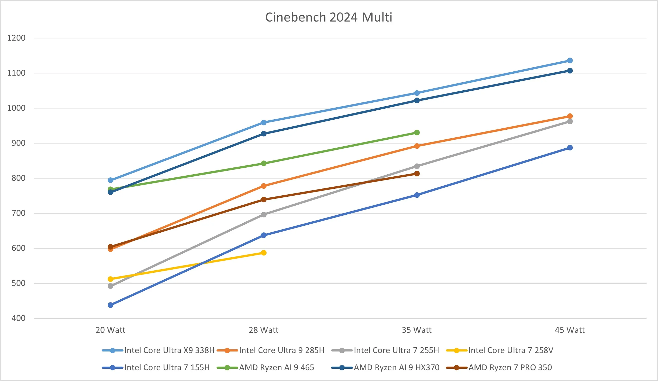 Jeśli chodzi o wydajność wielordzeniową, należy przyjrzeć się wartościom TDP, a także czystej wydajności. W przypadku X9 388H, oprócz standardowych limitów mocy, przeprowadziliśmy również pomiary ze stałymi limitami mocy wynoszącymi 20, 28, 35 i 45 watów. Przeprowadziliśmy również dodatkowe pomiary dla nowego Ryzena AI 9 465 przy 20, 28 i 35 watach. Oczywiście wydajność wzrasta przy niższych limitach mocy.