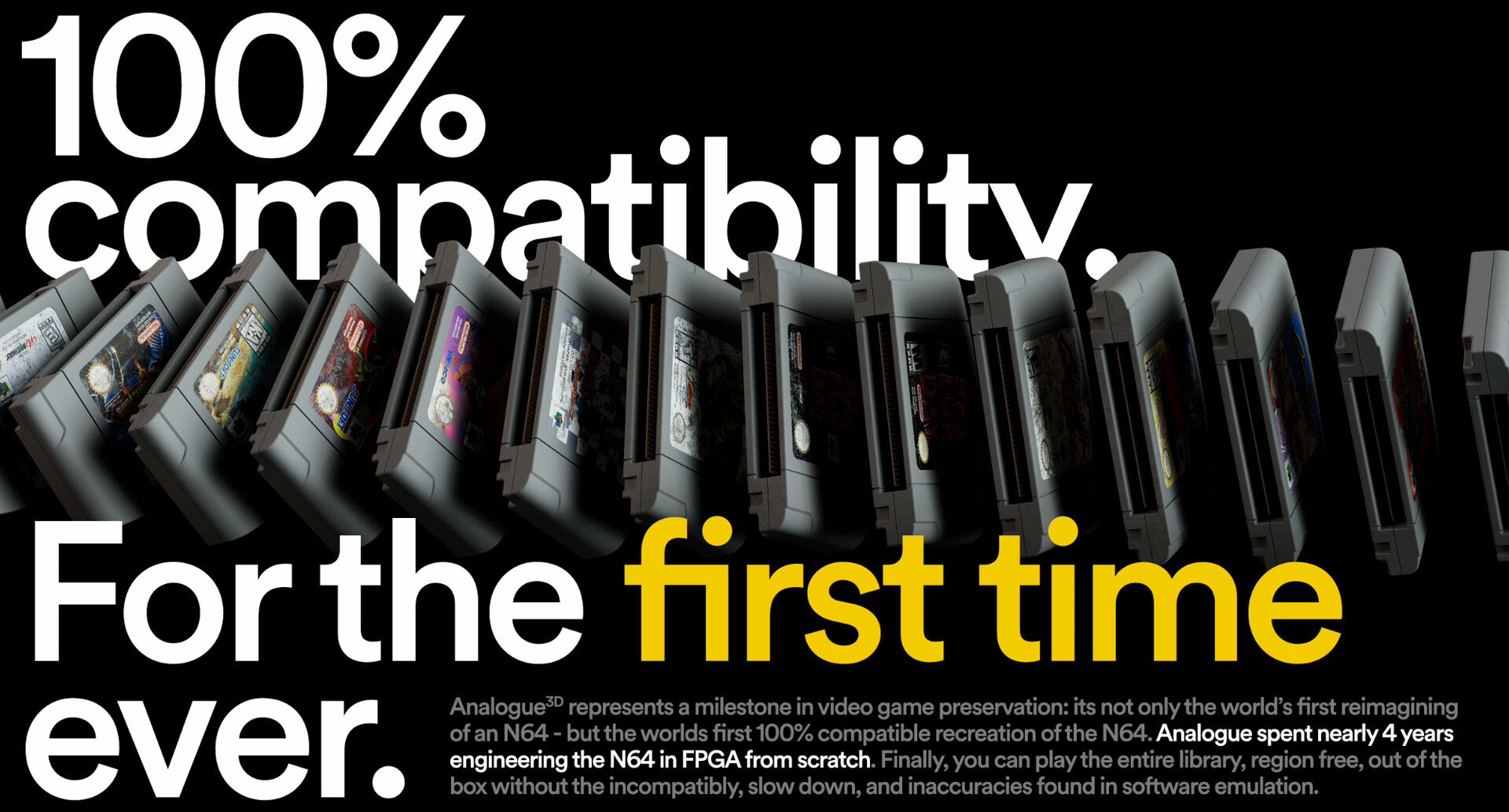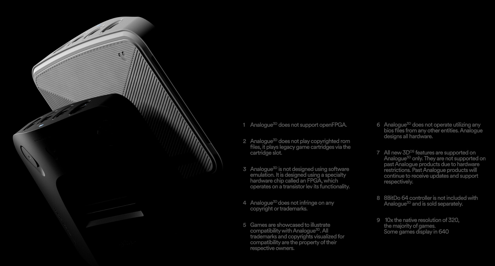 Niemniej jednak, Analogue twierdzi, że 3D zapewnia 100% kompatybilność z kartridżami. Ważna uwaga kryje się jednak na dole strony Analogue "Przedstawiamy Analogue 3D". Najwyraźniej konsola nie obsługuje openFPGA, w przeciwieństwie do Analogue Pocket (obecnie 320 dolarów na Amazon). W związku z tym nie będzie można grać w gry N64 przy użyciu plików ROM.