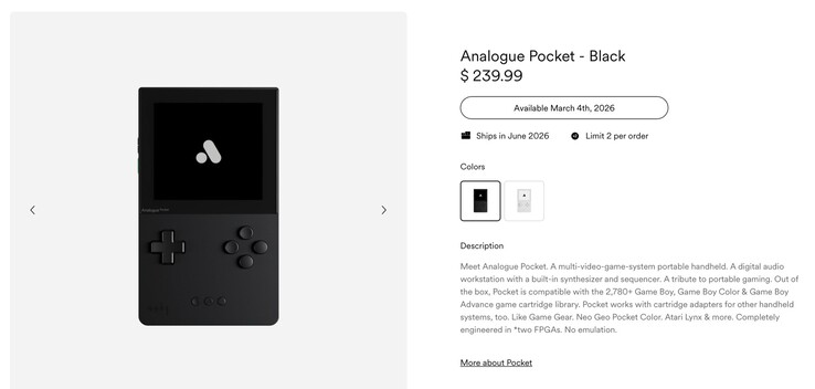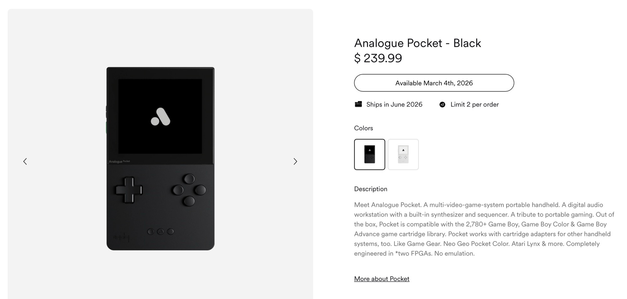 Po wyprzedaniu w ciągu ostatnich kilku tygodni, handheld do gier będzie ponownie dostępny do zamówienia w sklepie internetowym producenta https://store.analogue.co/products/analogue-pocket-black począwszy od środy, 4 marca, ale za 239 USD. Towarzysząca mu stacja dokująca będzie również dostępna do zamówienia w tym samym czasie za 99,99 USD. Oczekuje się, że oba produkty zostaną wysłane w czerwcu 2026 roku. Jak Analogue stwierdził na Xten ostatni wzrost cen jest spowodowany amerykańskimi taryfami celnymi, które są obecnie ustawione na 10% na import z całego świata