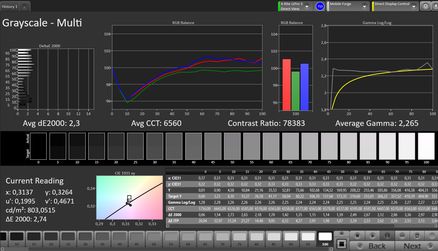 Kalibracja kolorów wyświetlacza została oceniona za pomocą oprogramowania analitycznego Calman i fotospektrometru, ujawniając jedynie niewielkie odchylenia od wartości referencyjnych.
