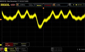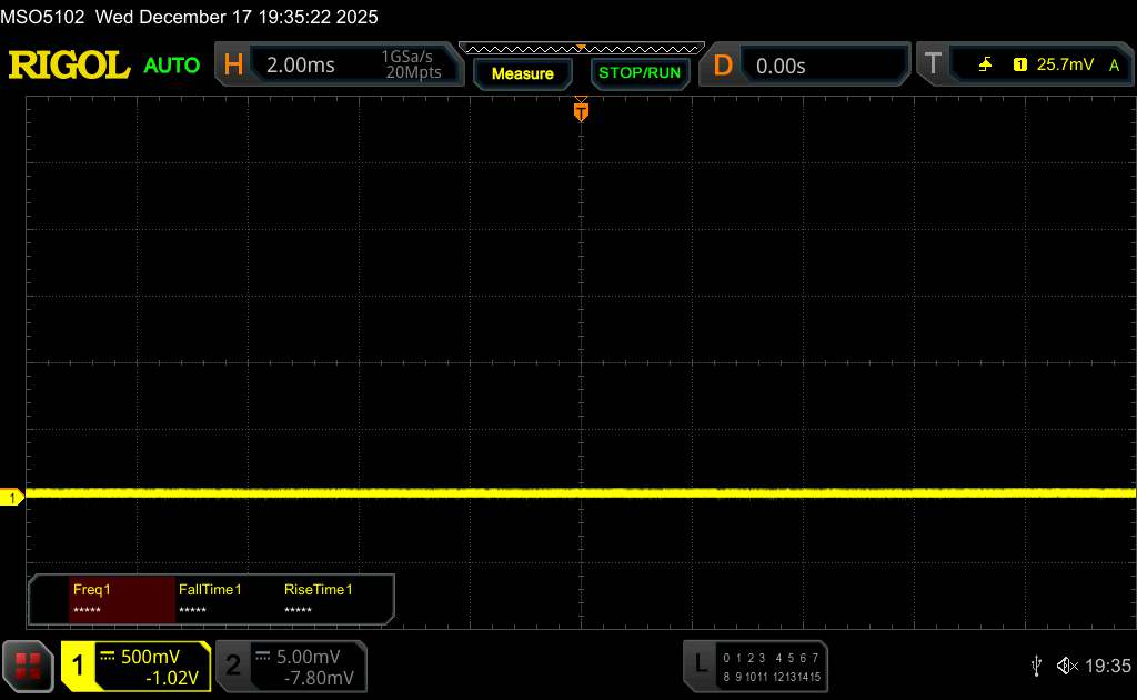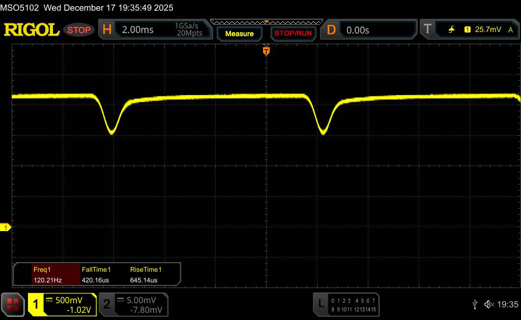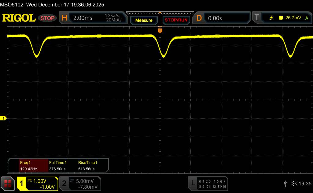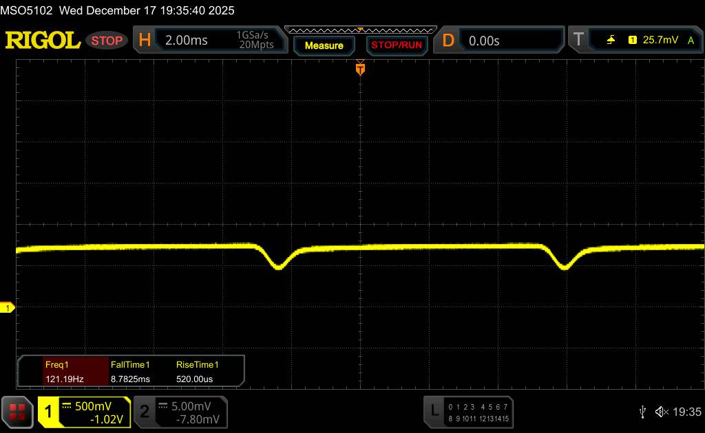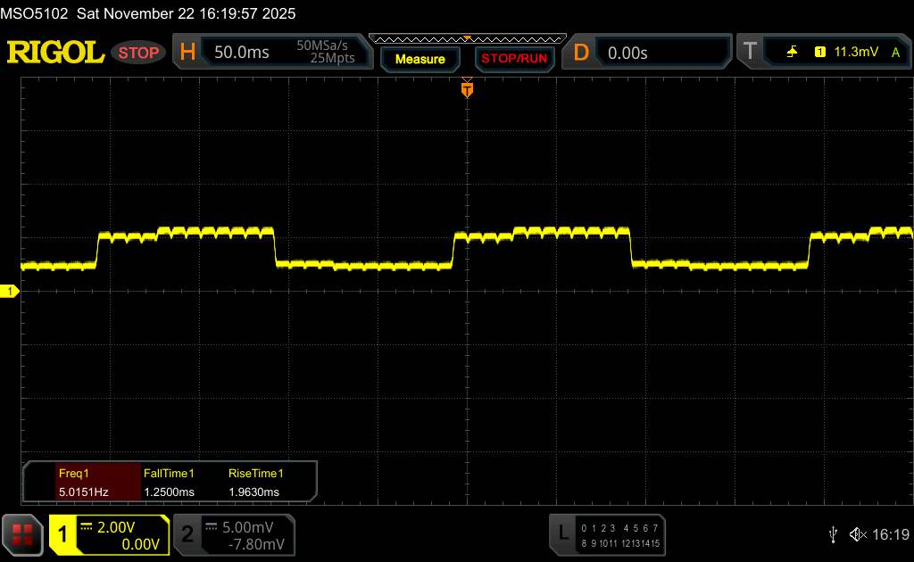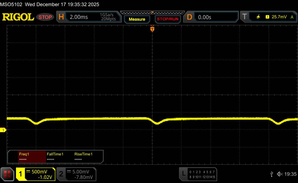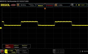 Ponieważ jest to panel OLED, jasność jest kontrolowana za pomocą modulacji szerokości impulsu. Według producenta, iQOO 15 wykorzystuje ściemnianie PWM o wysokiej częstotliwości przy 2160 Hz, aby zredukować potencjalne negatywne efekty, takie jak widoczne migotanie. Nasze pomiary przy użyciu oprogramowania Rigol wskazują na częstotliwość bazową wynoszącą około 560 Hz.