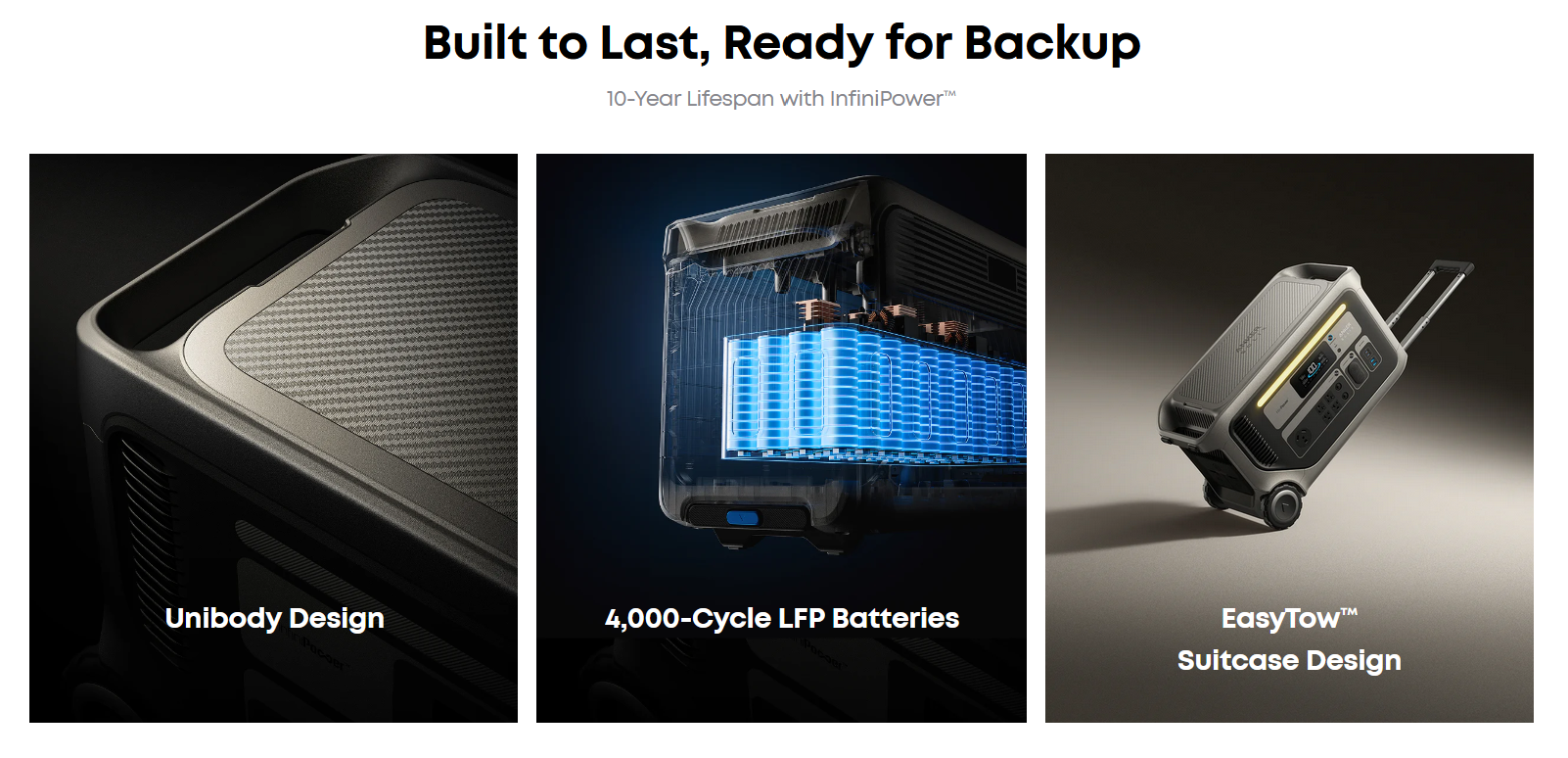 Anker Solix F3000 to prawdziwa bestia, ważąca 41,5 kg i mierząca około 65 x 30 x 37 cm, ale jej kółka i teleskopowy uchwyt sprawiają, że jest stosunkowo łatwa do przenoszenia. Oferuje dużą pojemność dzięki baterii LFP o pojemności 3 072 Wh i dużą moc dzięki 3600 W ciągłej mocy za pośrednictwem czterech gniazd. Pozwala to na zasilanie różnych urządzeń niezależnie od sieci, na przykład podczas przerwy w dostawie prądu lub podczas biwakowania. Jeśli ta pojemność nie jest wystarczająca, można ją rozszerzyć do maksymalnie 12 kWh za pomocą maksymalnie trzech dodatkowych akumulatorów BP3000.