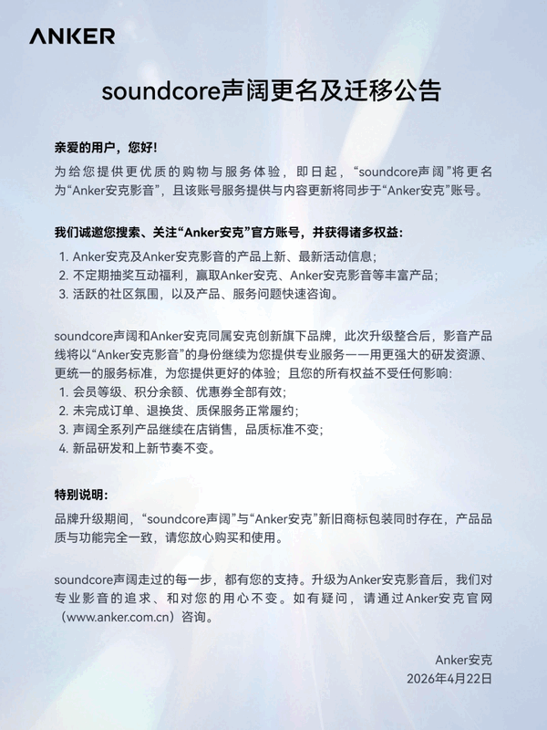 Zgodnie z komunikatem prasowym udostępnionym w kanałach mediów społecznościowych, Anker Innovations ujawnił, że porzuca markę Soundcore na rzecz Anker Sound & Video. W oświadczeniu prasowym ujawniono również, że usługi konta i aktualizacje treści dla nowej marki będą teraz zsynchronizowane z oficjalnym kontem Anker.