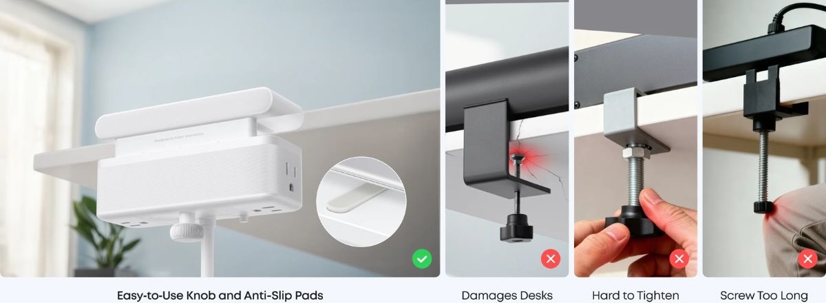 Listwa zasilająca Nano firmy Anker ma regulowaną konstrukcję zaciskową, z dwiema połówkami zamocowanymi powyżej i poniżej biurka za pomocą zintegrowanego pokrętła. Według firmy, system ten utrzymuje urządzenie bezpiecznie w miejscu, umożliwiając użytkownikom podłączanie i odłączanie urządzeń jedną ręką bez ich przesuwania. Została zaprojektowana tak, aby pasowała do biurek o grubości od 0,6 do 1,8 cala (~12 do 45 mm), a ta ładowarka GaN ma wymiary 6,02 x 2,06 x 3,97 cala (153 x 52,2 x 100,85 mm).