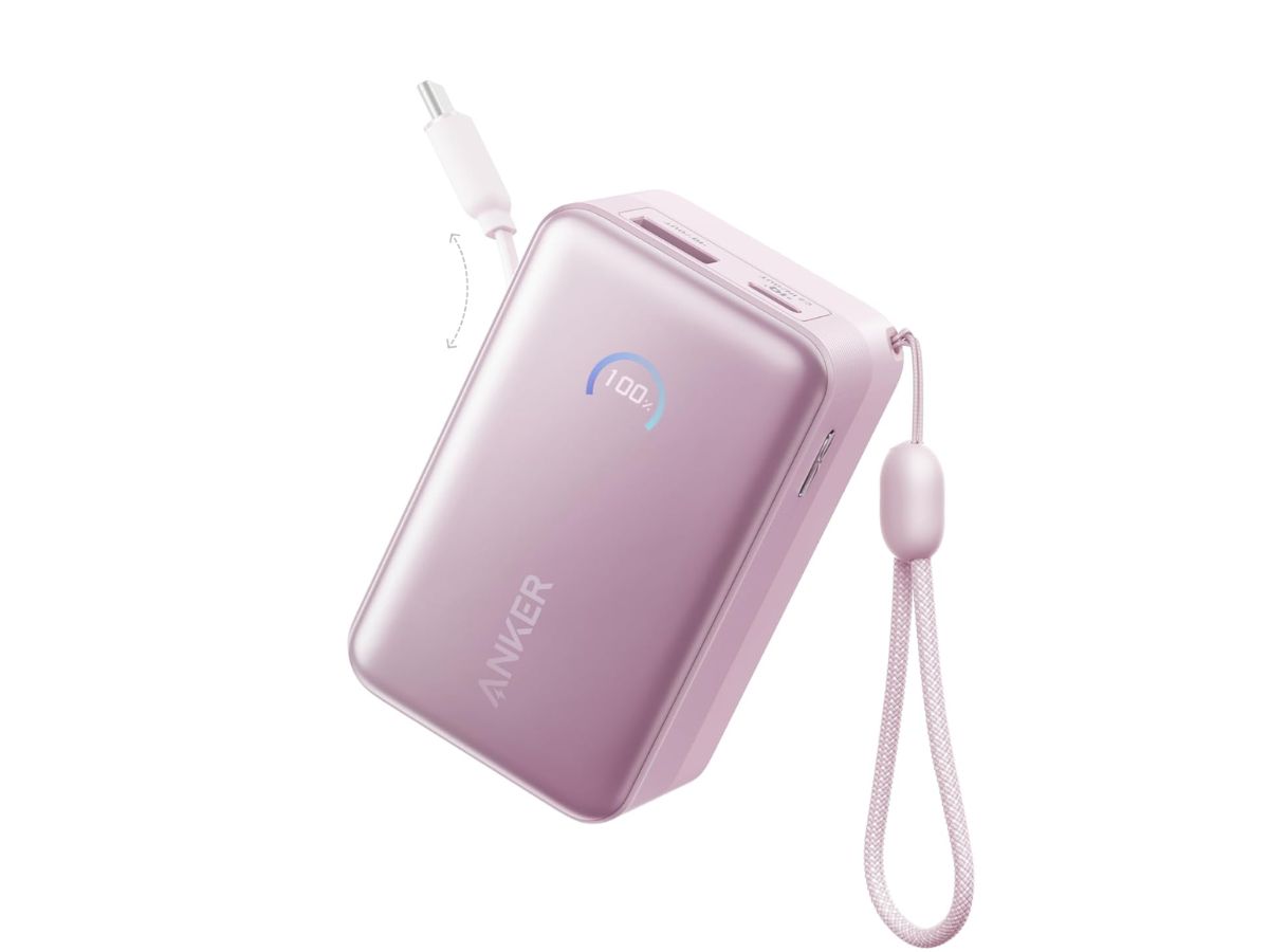 Nowy Anker Nano Power Bank (10K, 45W, wbudowany zwijany kabel USB-C) ma dwukolorową metaliczną różową obudowę, z dopasowanym zintegrowanym kablem z oplotem zewnętrznym. Poza kolorem, ta wersja akcesorium jest identyczna jak jej poprzednik. Oferuje trzy wyjścia: kabel USB-C i port USB-C, każdy o mocy do 45 W, oraz port USB-A o mocy 22,5 W. Według firmy Anker, mogą Państwo naładować iPhone 17 Pro Max do 40% w 20 minut z mocą wyjściową 40W. Gdy wiele portów jest używanych jednocześnie, maksymalna łączna moc wyjściowa wynosi 24 W.