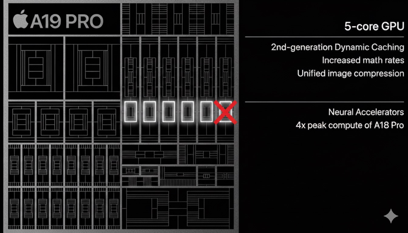 Wolniejszy PROCESOR GRAFICZNY A18 ma nie tylko o 1 rdzeń mniej; musi również zadowolić się starszym silnikiem wyświetlania i koderem/dekoderem wideo.