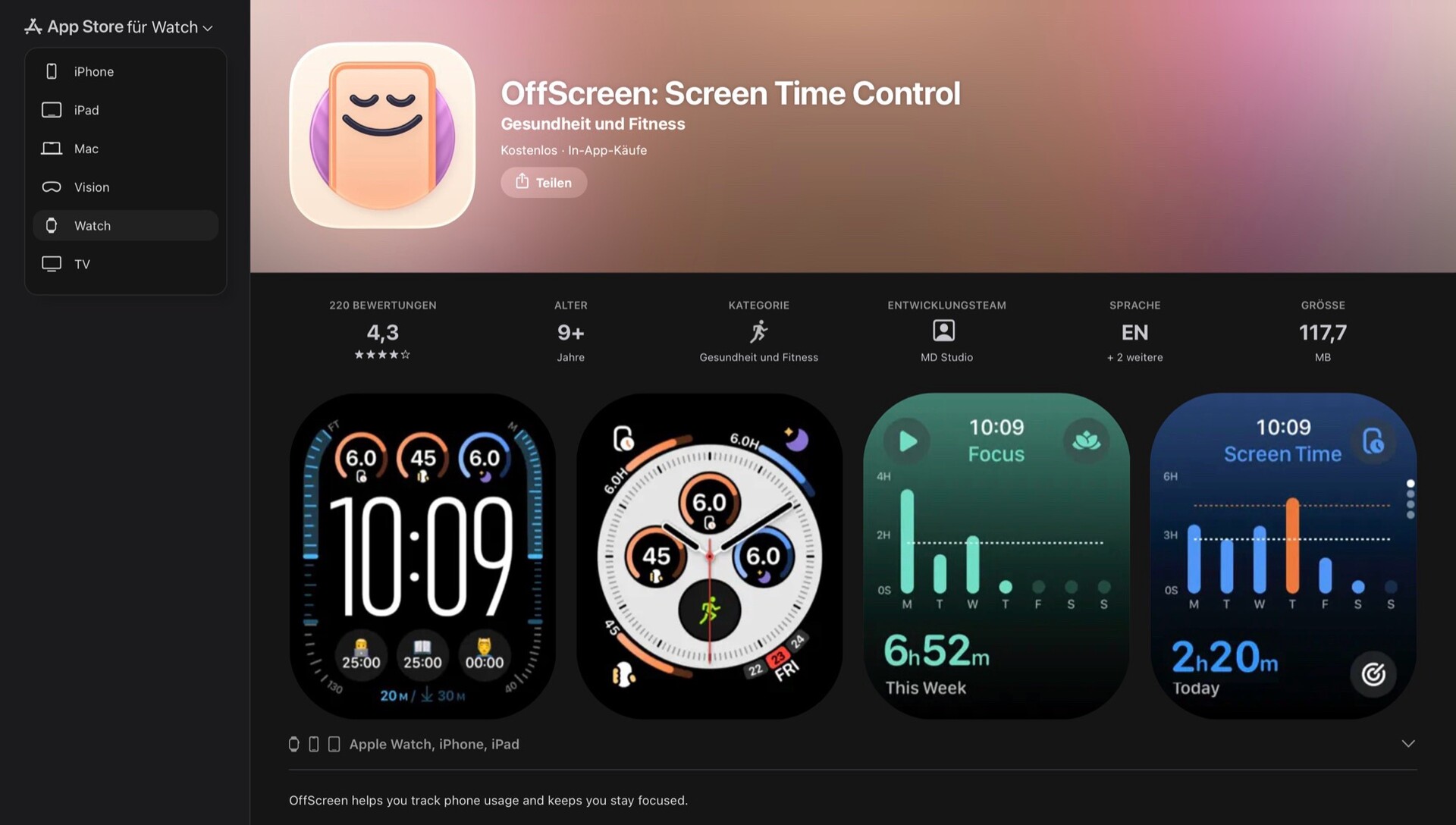 Przycisk w lewym górnym rogu ekranu pozwala szybko przełączać się między wszystkimi platformami Apple, co jest wygodne do przeglądania dostępnego oprogramowania dla Apple Watch, Apple TV 4K lub Apple Vision Pro przed zakupem odpowiedniego produktu